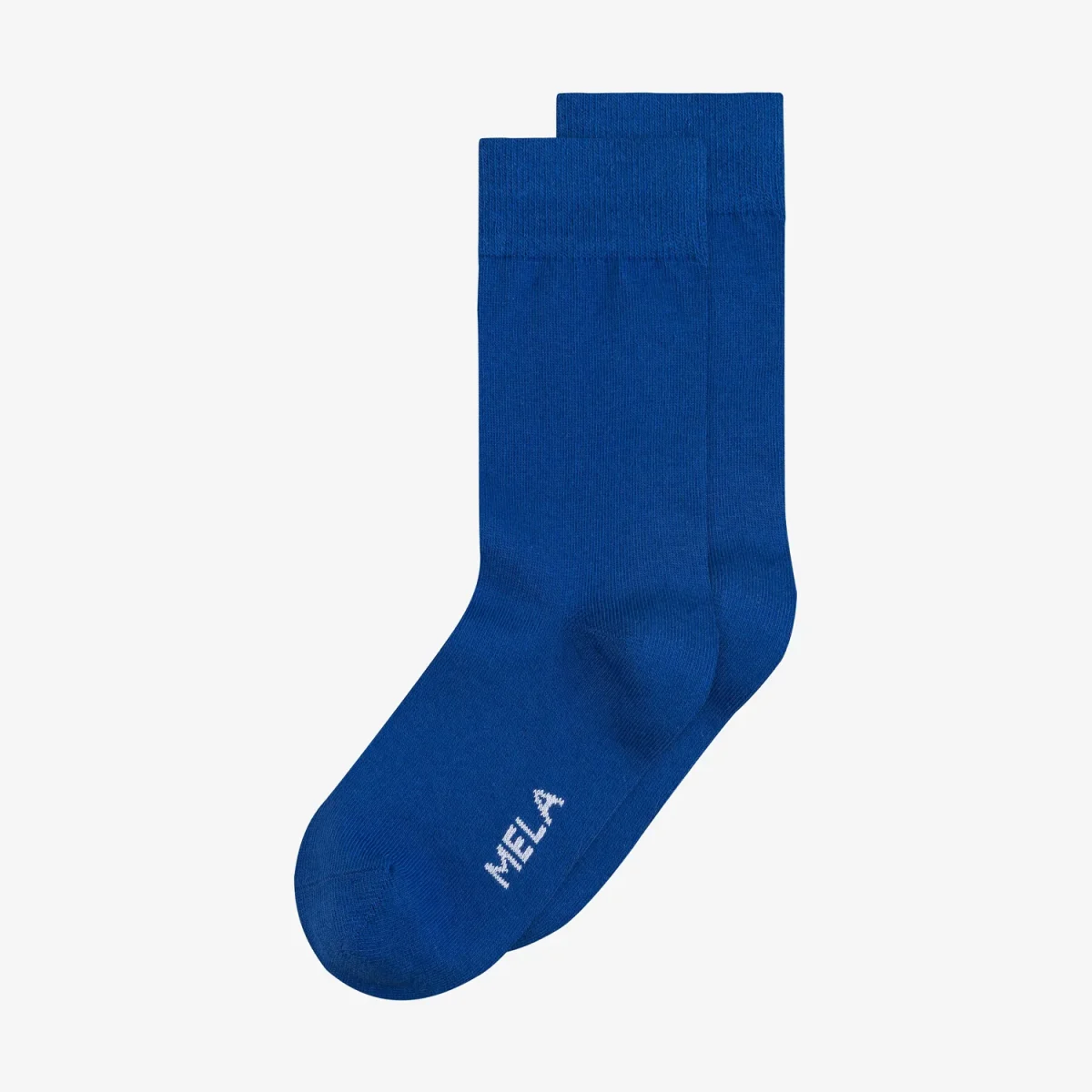 Tack vare MELA´s dedikation till att pressa priserna utan att tumma på kvalitet, miljö & arbetsförhållanden kan vi äntligen erbjuda en riktigt sjysst ekologisk strumpa till ett budgetpris. Dessa knallblå strumpor innehåller ingen plastig polyester eller polyamid. Tom den lilla gnutta (3%) elastan som gör att strumpan sitter bra & skönt är inte ens en vanlig elastan. Istället använder man sig av ROICA som är en helt ny typ av elastan som är mycket vänligare mot miljön. Strumpan har tom sytts ihop med hjälp av en ekologisk bomullstråd istället för en i syntet.