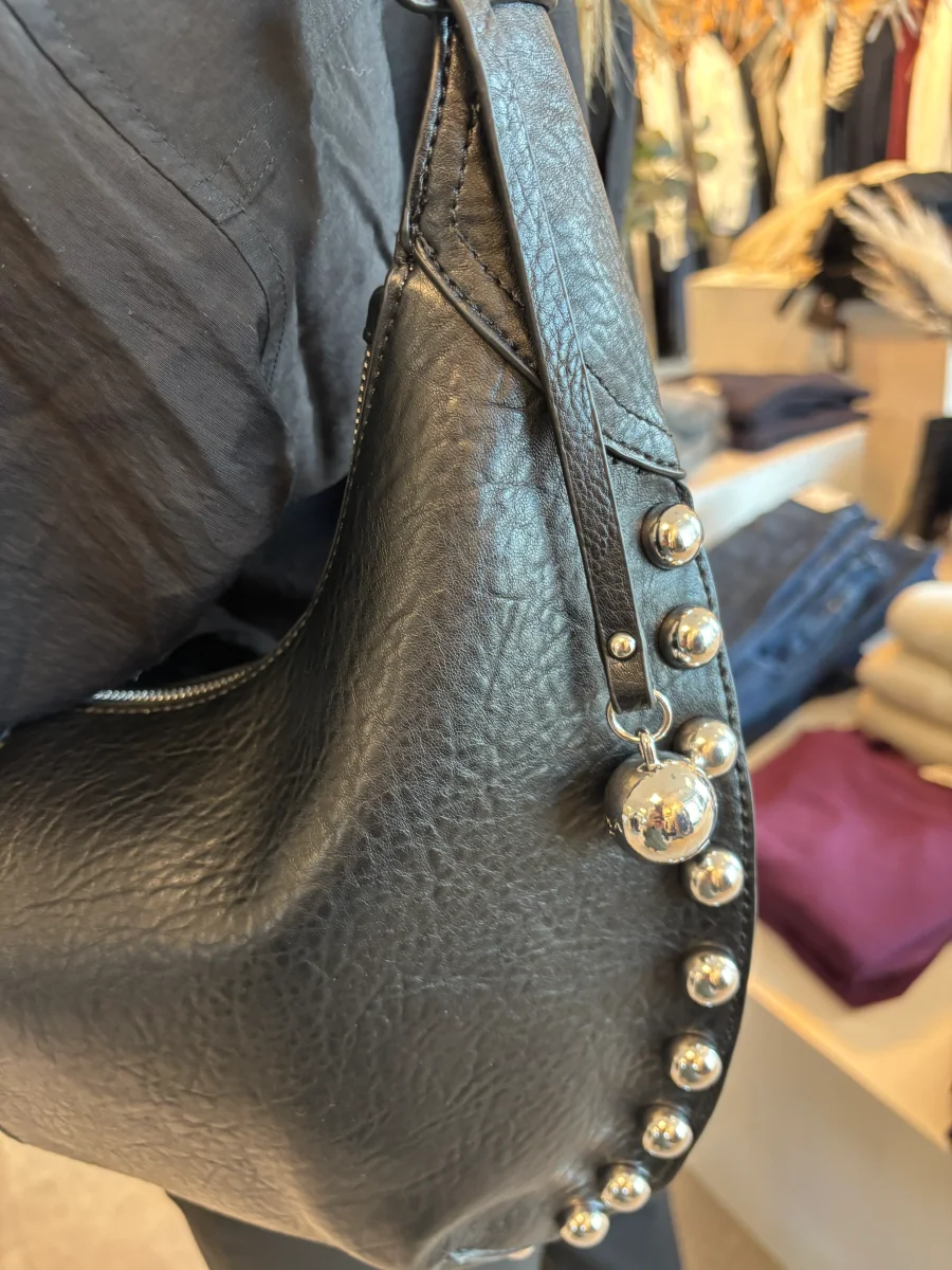 En trendig väska med silvernitar runt kanten som ger en cool känsla. Axelbandet pryds av ett elegant hänge med silverkula som blir en snygg detalj. Perfekt storlek för vardag och kväll, och enkel att matcha till olika outfits.