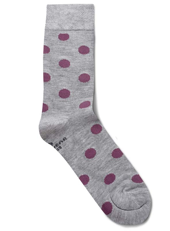Mjuk och skön bambustrumpa i grå färg med lila prickar. Strumpan har en löst åtsittande resår vilket gör den extra behaglig att ha på foten. Eftersom den är tillverkad av en viskos av bambu blir den fantastikt mjuk och skön!