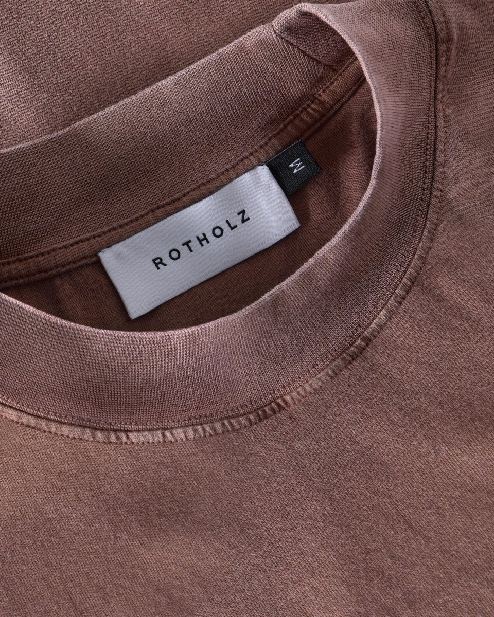 Brun t-shirt i 100% ekologisk bomullstrikå med bred & ganska tajt/hög, ribbstickad mudd kring halsringningen. Riktigt stilig t-shirt i en lite tjockare & lyxigare kvalitet.
