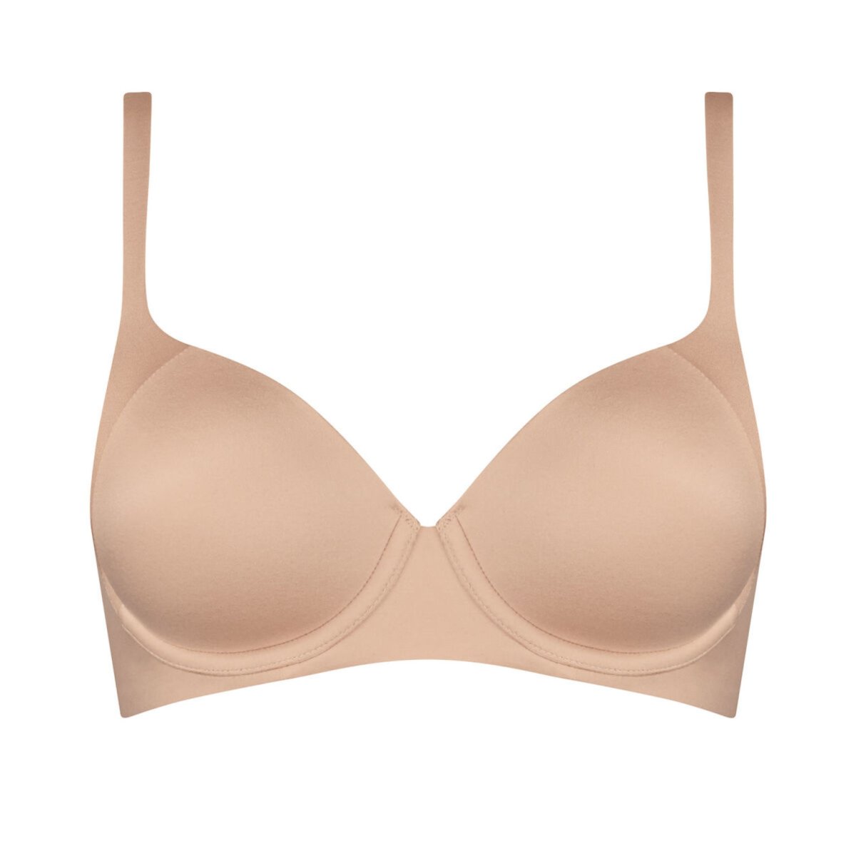 En bh från Triumph med lätt vadderade kupor och byglar som ger bysten en rund och fin form. En tidlös modell med breda, sömlösa kanter och sidor som gör att bh:n blir osynlig under kläderna vilket blir en favorit till vardagen. Kuporna är överdragna med uppruggad superfin jersey som har en sammetslen yta. Axelbanden är justerbara och överdragna av vackert skimrande satin-jersey.