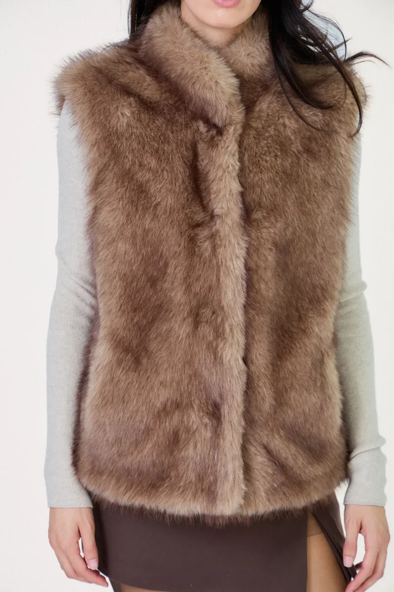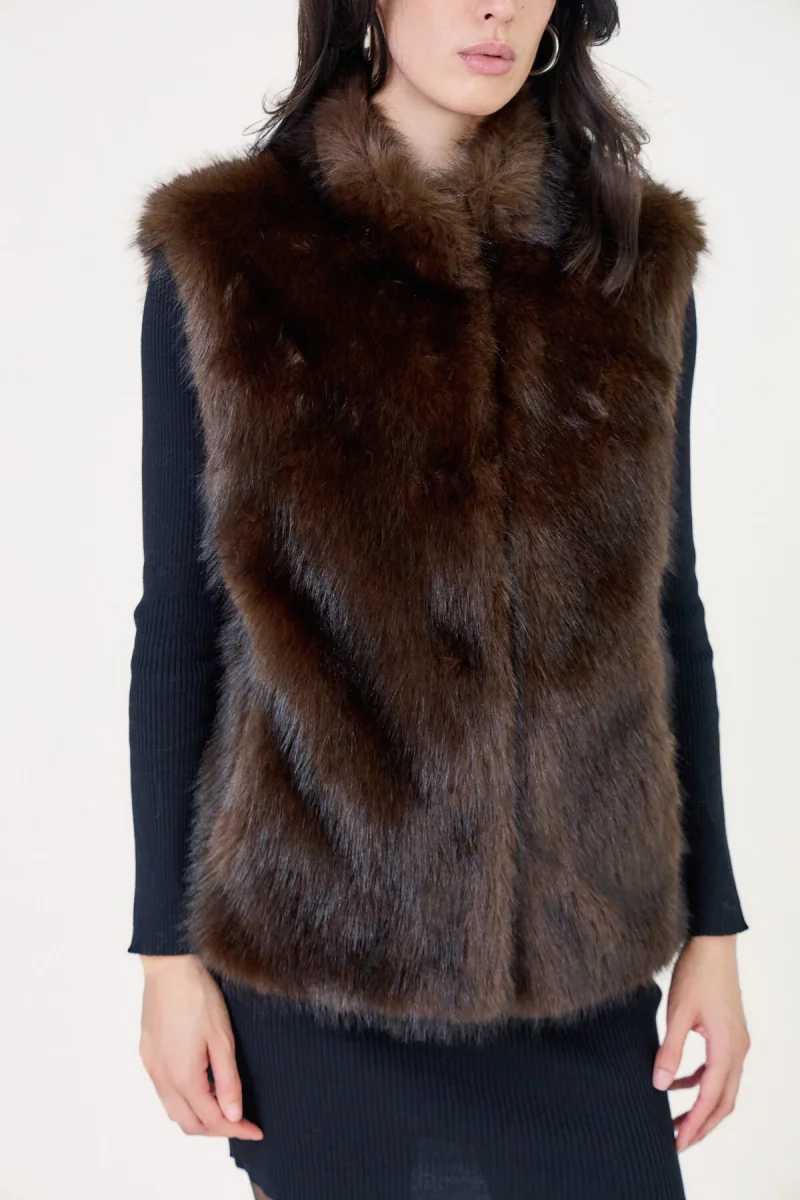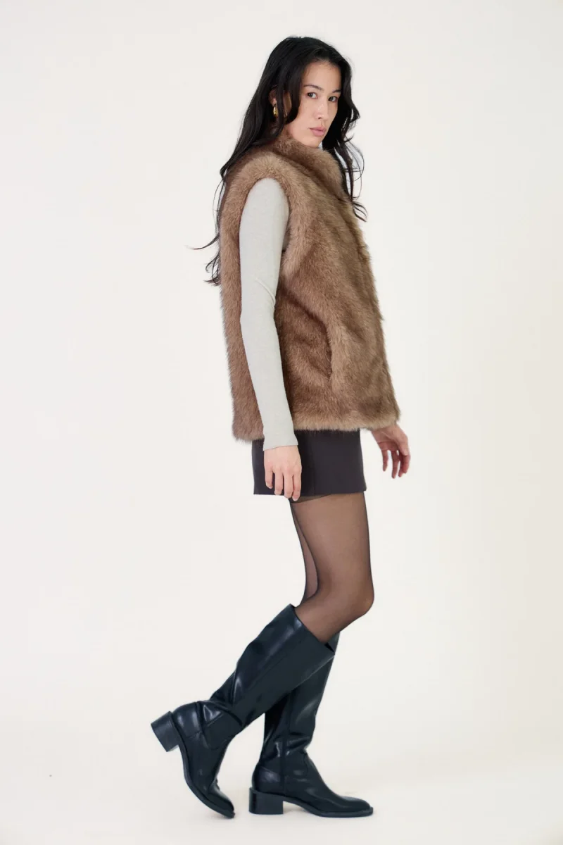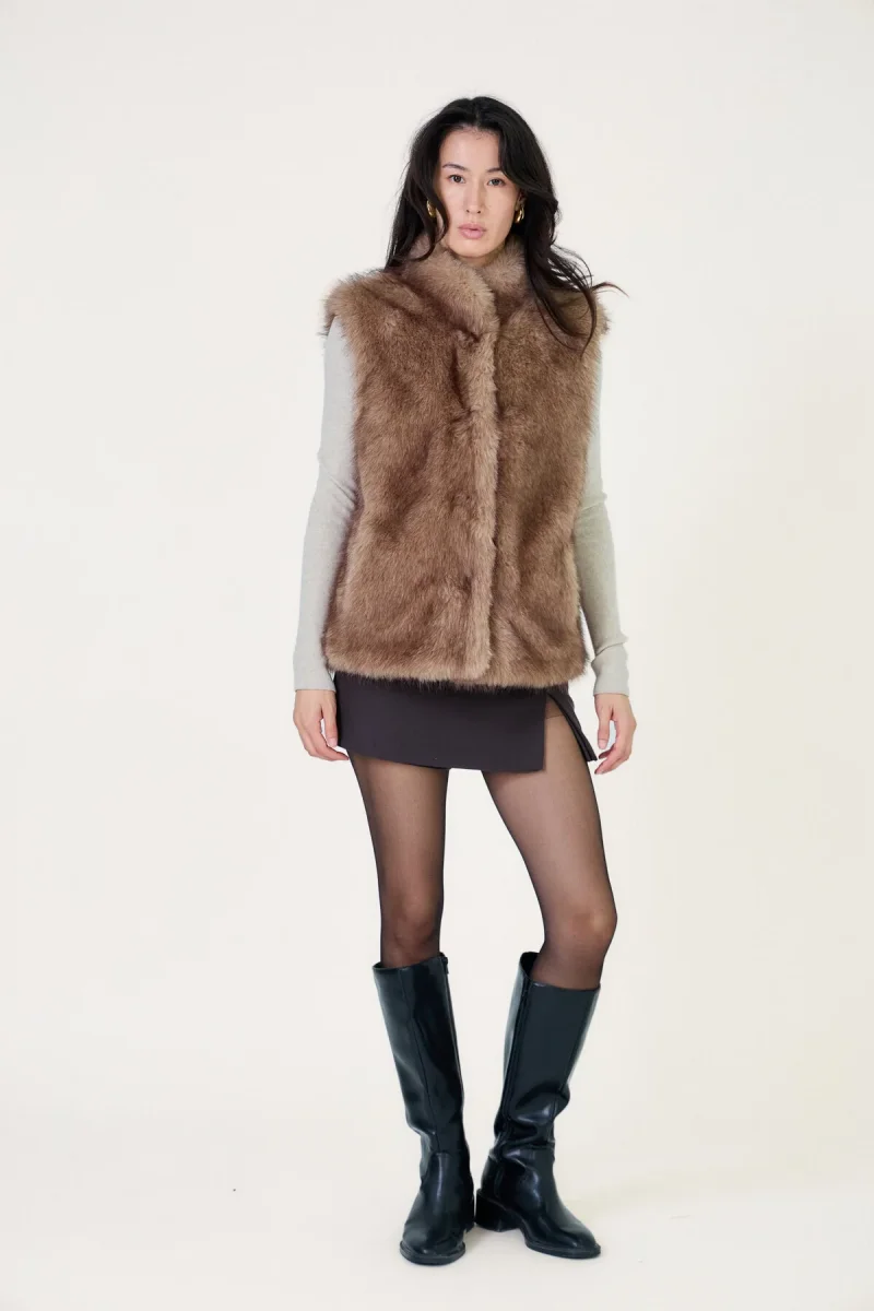 Escandelle Sleeveless vest är en mjuk och mysig vest i faux fur som snabbt blir en favorit i garderoben. Perfekt när du vill höja din outfit utan att behöva krångla till det. Den här västen är både stilfull och enkel att bära, lika snygg över en stickad klänning eller skinnjacka som till jeans och boots.