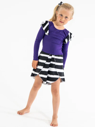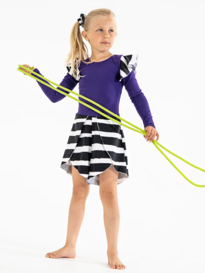 Catsuit med fina volangdetaljer på axlarna. Denna catsuit har innershorts och lösa ben. Tillverkad i en härligt mjuk bomullskvalitet som är perfekt för barn att röra sig i. [b]FÄRGKOMBINATIONEN HAR AVSLUTATS OCH DET ÄR DÄRFÖR ENDAST MÖJLIGT ATT BESTÄLLA DE FÄRGER OCH STORLEKAR SOM VI FORTFARANDE HAR I LAGER[/b]