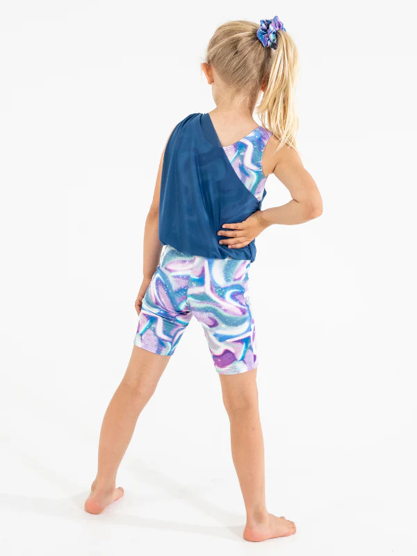 Söt catsuit för flickor med ett extra lager av lättvikts siviglia som är fastsytt i midjan och över ena axeln. Catsuiten är i ett stycke, men ger effekten av två sammansatta delar. Finns i storlekarna 4-16 år. [Restorder i mån av tillgång.