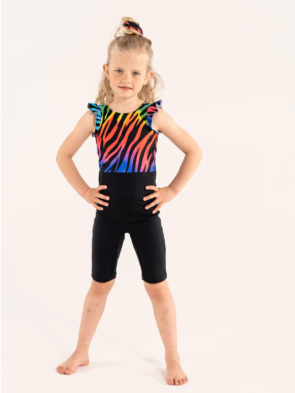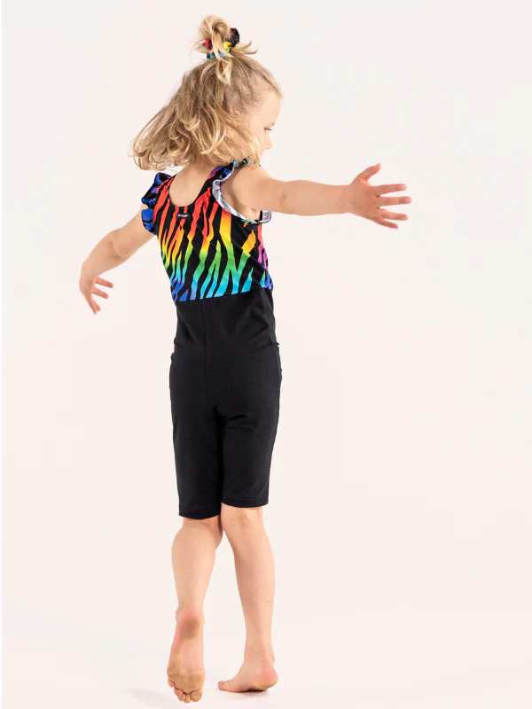 En vacker catsuit med tryck i gymnastiktema och söta volanger på axlarna.