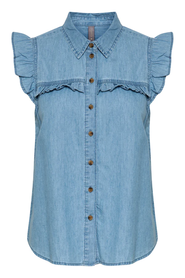 Aurelia Sleeveless Shirt från Culture, en ärmlös skjorta med feminina volanger och klassisk krage. Den avslappnade passformen kombineras med fina knappar framtill och ett lätt, mjukt tyg som ger både stil och komfort. Perfekt till både shorts och kjol för en ledig men genomtänkt look. En mångsidig topp som passar lika bra till vardag som semester.