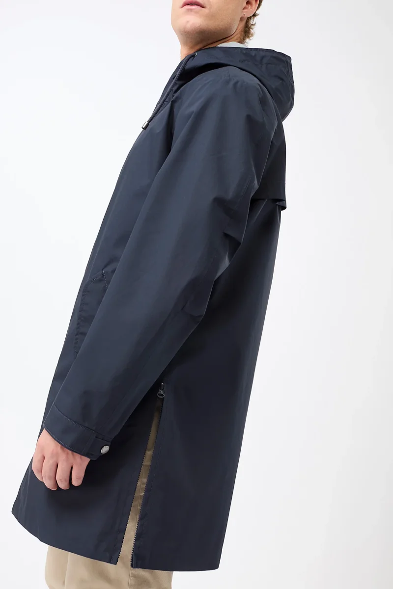 Marinblå vår & höstparka med membran tillverkad av mestadels ekologiska & återvunna material. Langerchen Darkin har en helt ny sorts materialmix mot tidigare versioner av vår mest uppskattade regnplagg. Den ekologiska bomullen är numera förstärkt med 32% återvunnen polyester vilket resulterar i mer slitstyrka & bättre komfort. En vanlig parka till det yttre men som funkar alla väderförhållanden.