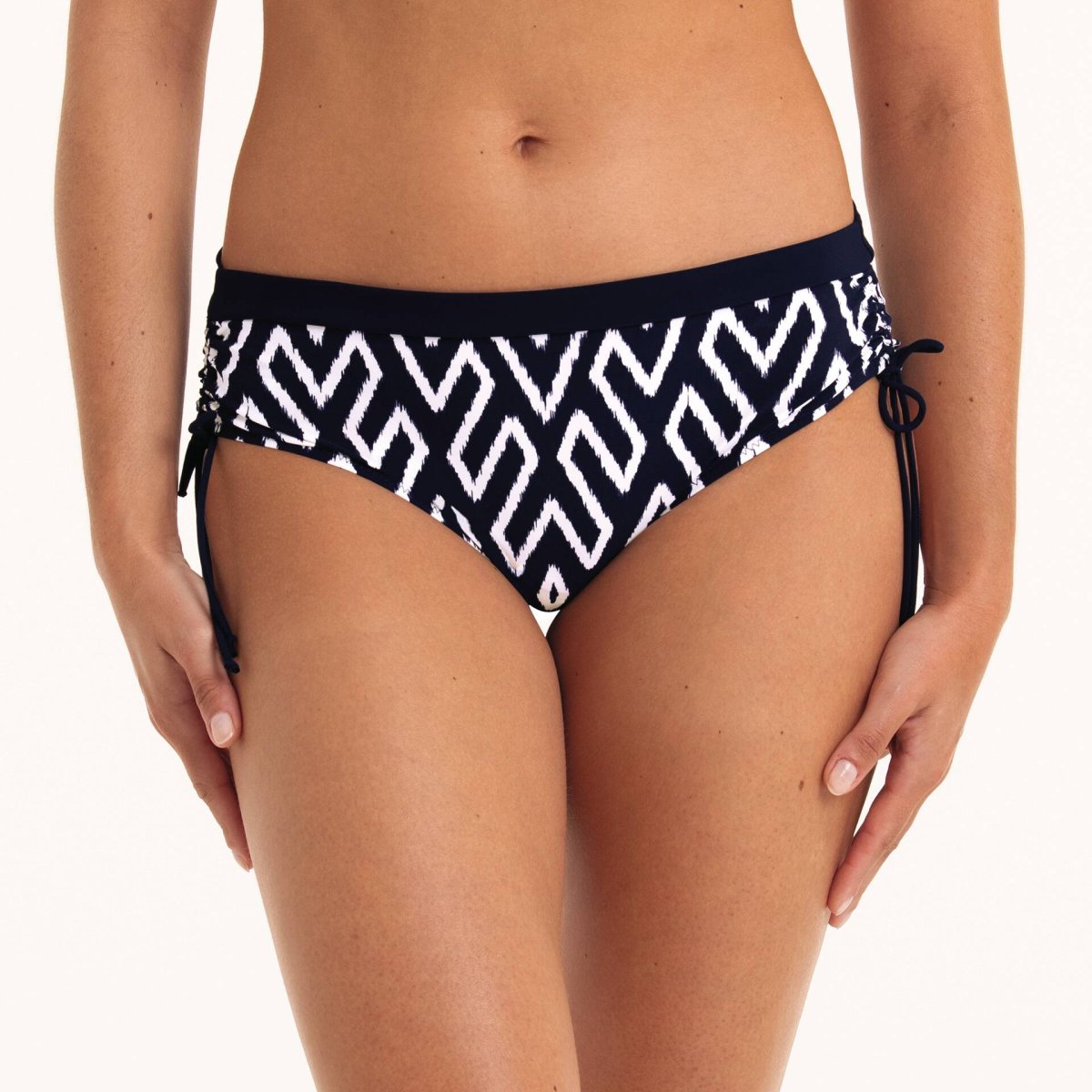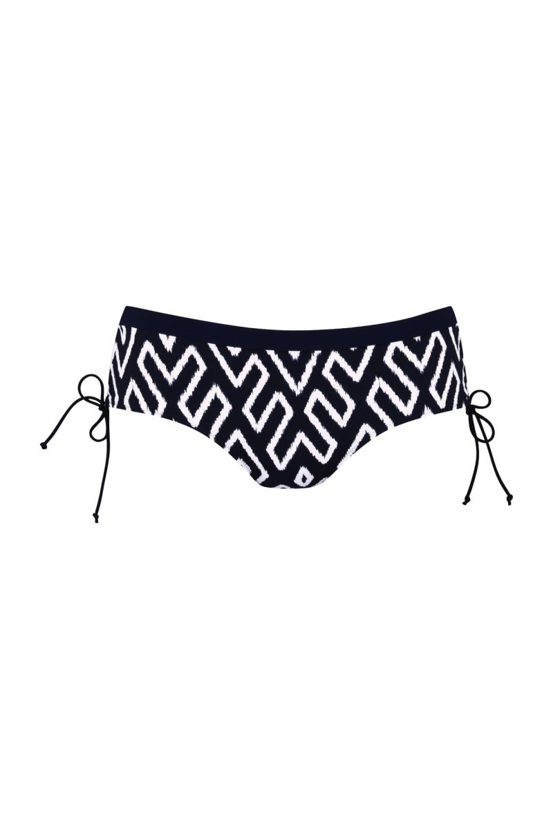 Ebru bikinitrosa är en hipstertrosa med en platt benskärning och ett smalt, mjukt 360° midjeband. En justerbar rynkdel med smala knytsnören på sidorna har lagts till för att justera bredden. Geometriskt mönster på en blå bas. Perfekt om du letar efter mångsidiga och snygga bikinitrosor. Matcha med Alia top och Garda tunika för ett snyggt set.