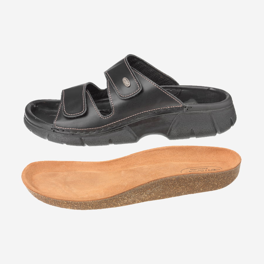 Embla 2015 är en herrsandal med löstagbar innersula vilket gör det möjligt att anpassa egna fotbäddar/inlägg. Justerbara kardborreremmar.
