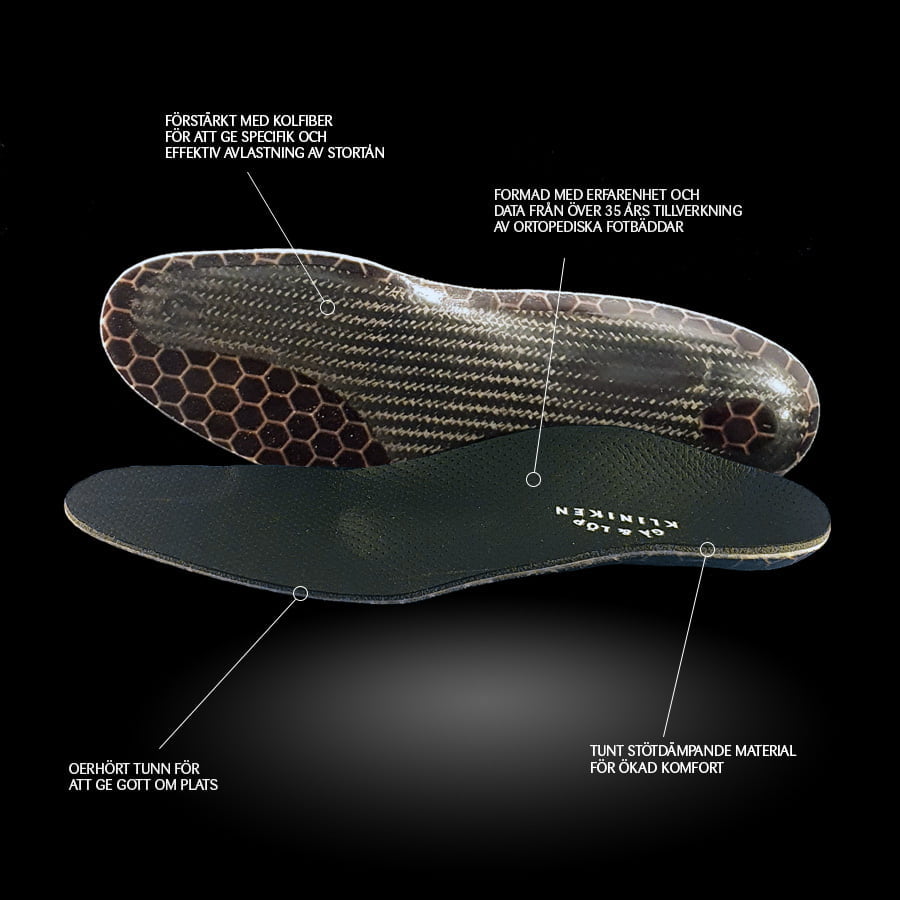 Kolfibern bidrar också till att skoinlägget tillverkas i en väldigt tunn design. Personer med hallux valgus och hallux rigidus har ofta besvär med att skor trycker över stortåleden. Att då placera in ett grövre inlägg kan ställa till besvär men den risken är minimal med det här inlägget.