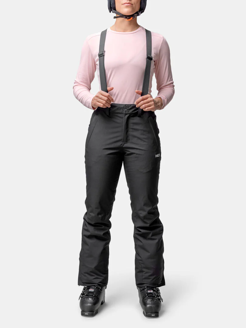 Standardpassform och stilren look kompletteras med funktionella detaljer som avtagbara hängslen, snölås och förstärkta benslut. Passar perfekt med alla Halti skidjackor.