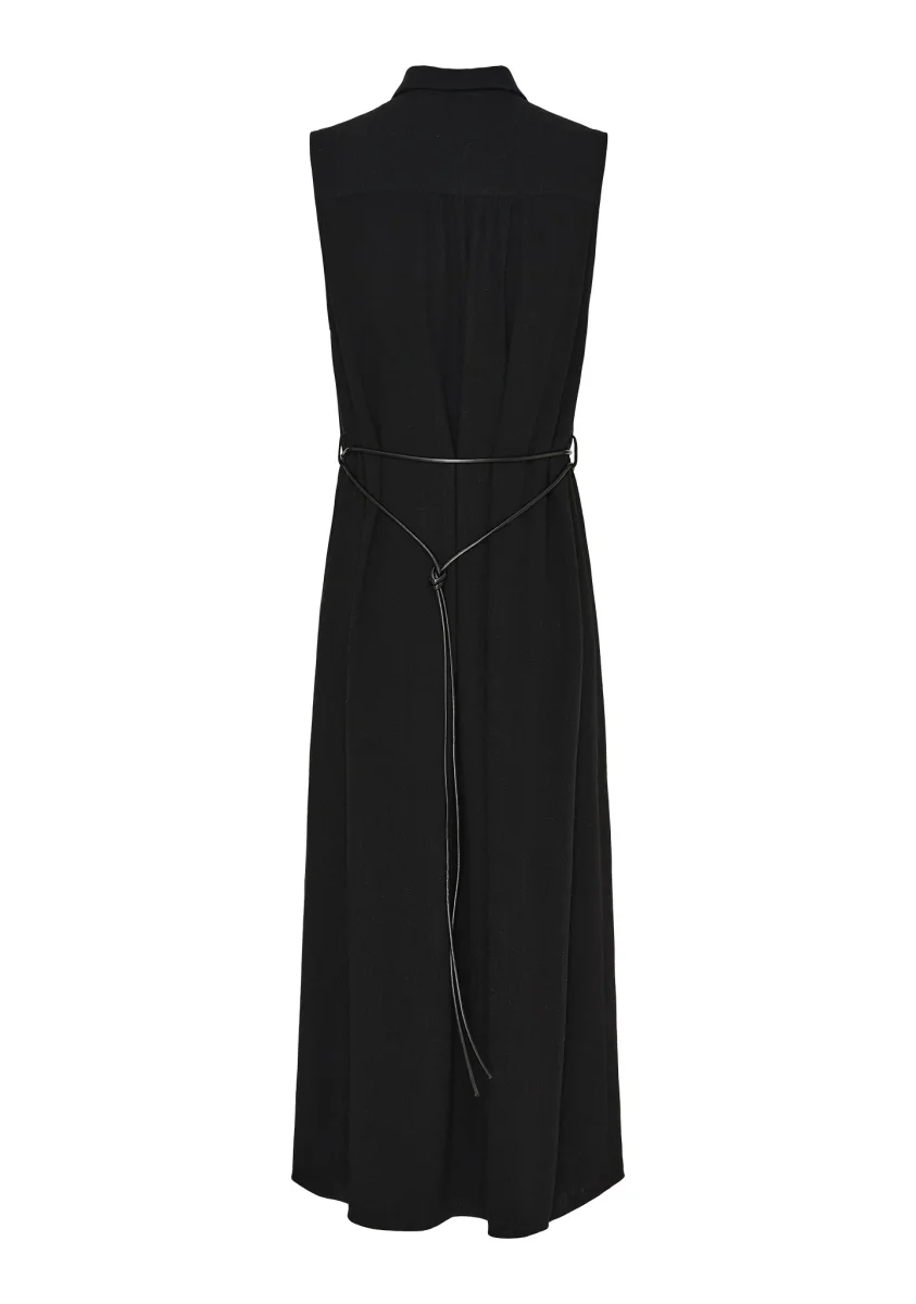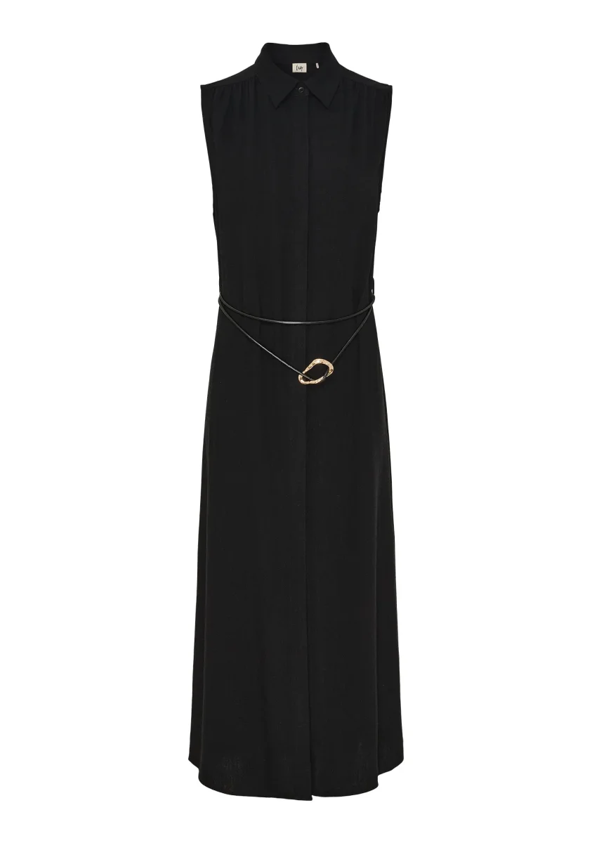 Klänningen kommer med ett smalt knytskärp i midjan som markerar figuren och skapar en feminin form. Den är ärmlös och tillverkad i ett lätt material i linne och viskos som faller fint längs kroppen och ger en bekväm känsla hela dagen.