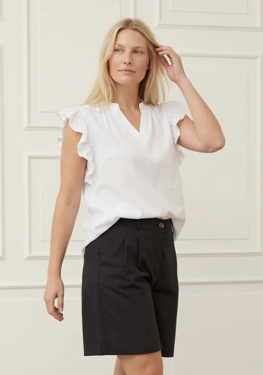 Pearl Flounce Top från Isay är en luftig topp i en mjuk blandning av linne och viskos som ger en skön och lätt känsla. Den har en avslappnad passform med v-ringad framtill och volang vid ärmslut som ger ett fint fall och lite extra rörelse.