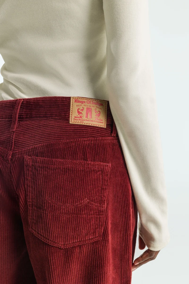 Joan Corduroy Madder Brown från KOI – Kings of indigo är en ny modell med lägre midja & loose fit samt en böjd midja som härmed också finns i den snyggaste manchestervarianten vi nånsin skådat. Tyget är tillverkat av 100% ekologisk bomull. Samtliga metalldetaljer är tillverkade av återvunna material såsom nitar & dragkedjor. För att fickorna ska hålla bättre är de förstärkta med återvunnen polyester.