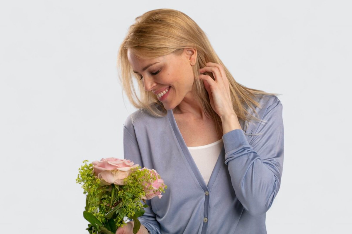 Tunn och Cardigan av finaste Mullbärssiden, 100% siden, sidentrikå. Ger en vacker glans och är dessutom fantastiskt skön och skonsam mot huden. Sidentröjan är stickad i 100-grams kvalitet.
