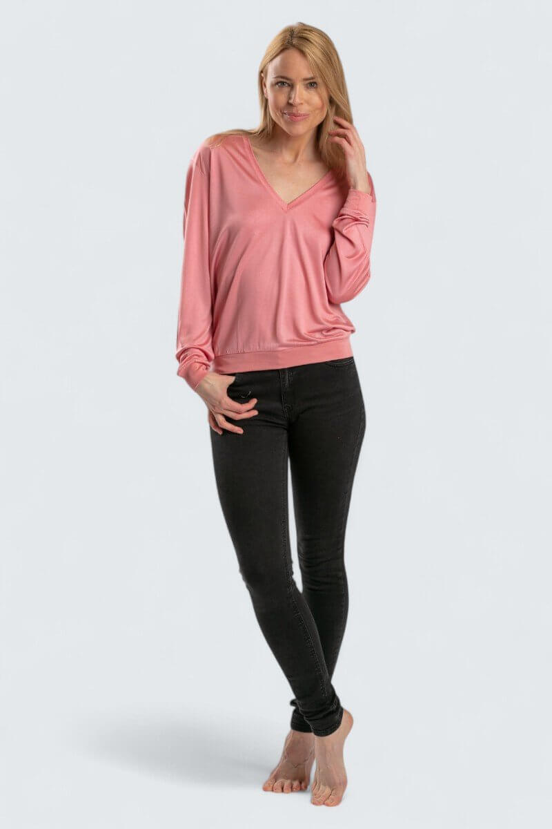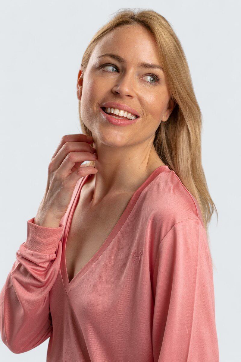Tunn och fin v-neck av finaste Mullbärssiden, 100% siden. Ger en vacker glans och är dessutom fantastiskt skön och skonsam mot huden. Plagget är stickat i 100-grams kvalitet. En härlig sidentröja av sidentrikå.