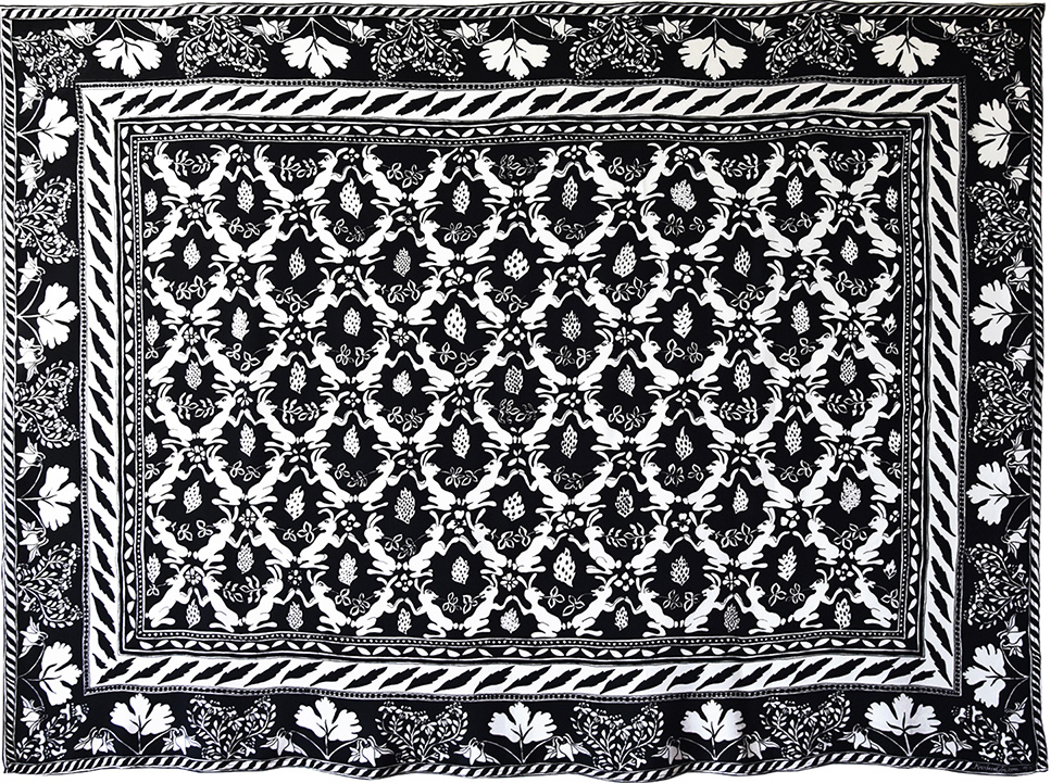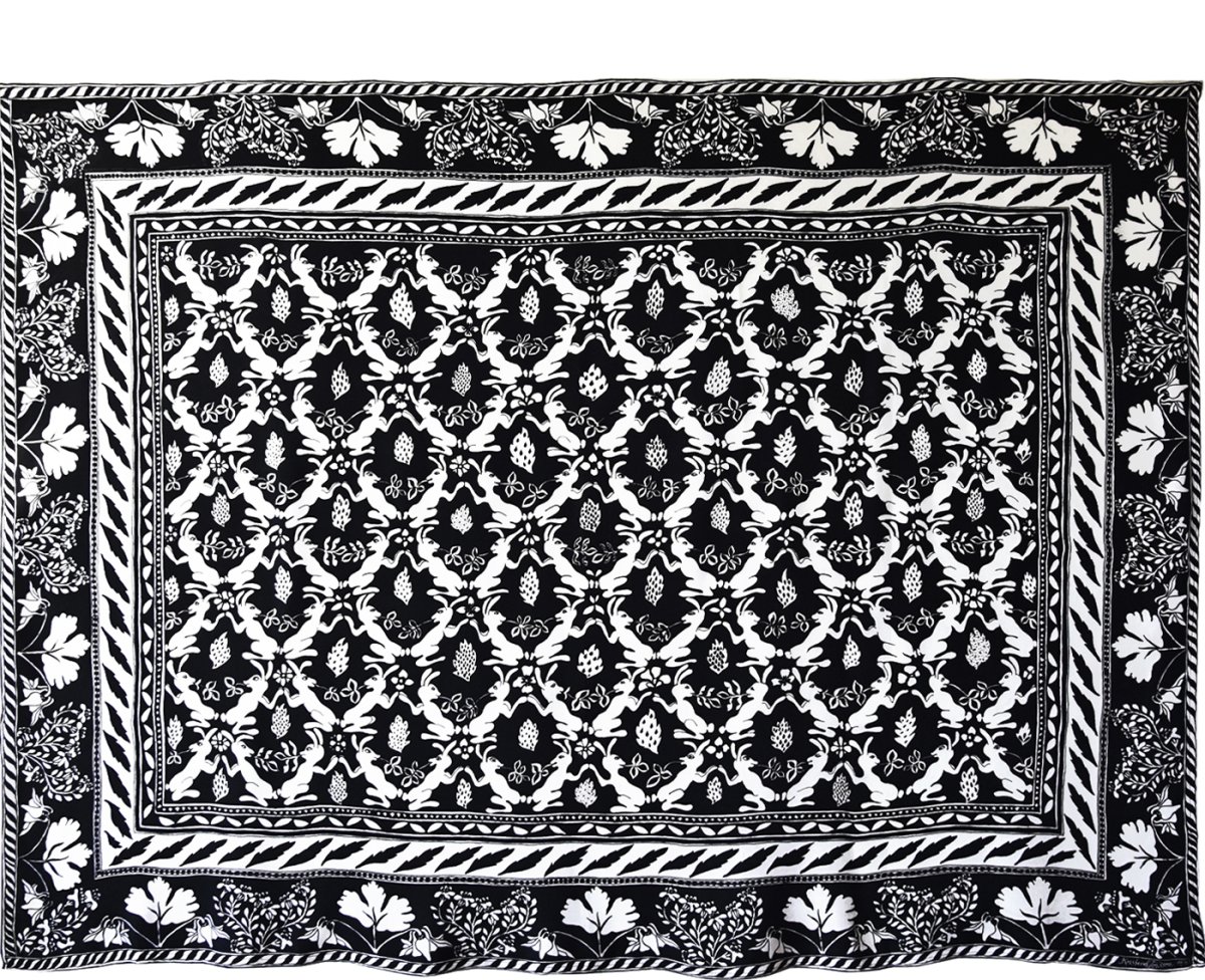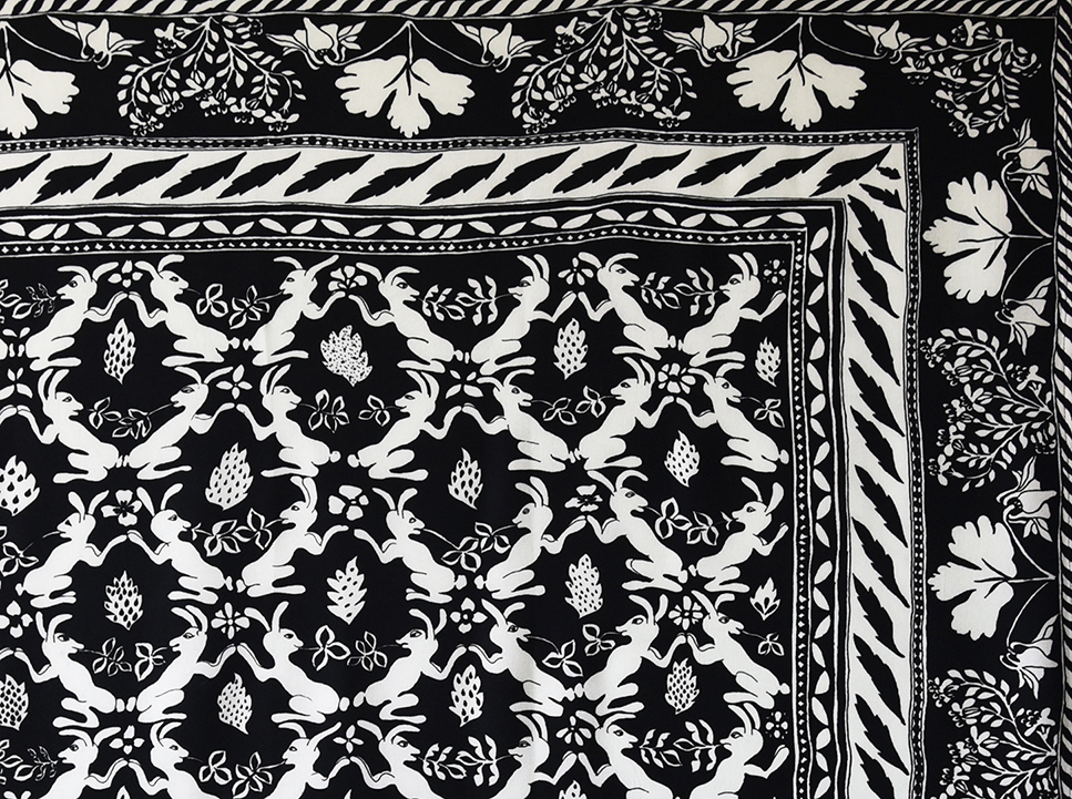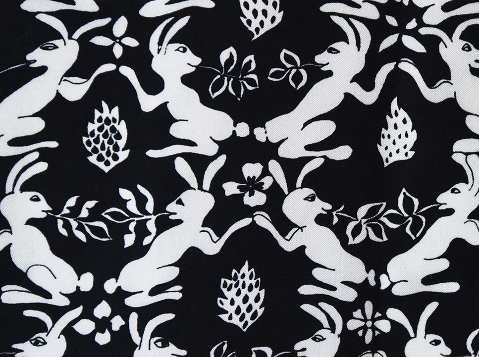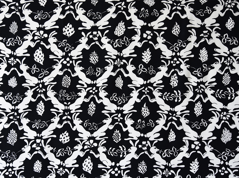 Kanga med dansande kaniner i en skog av enebuskar. På bården runtom syns akvileja och tulkört.