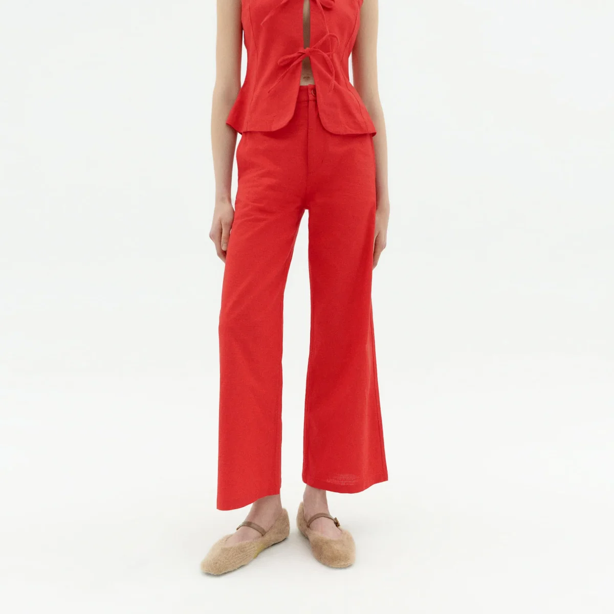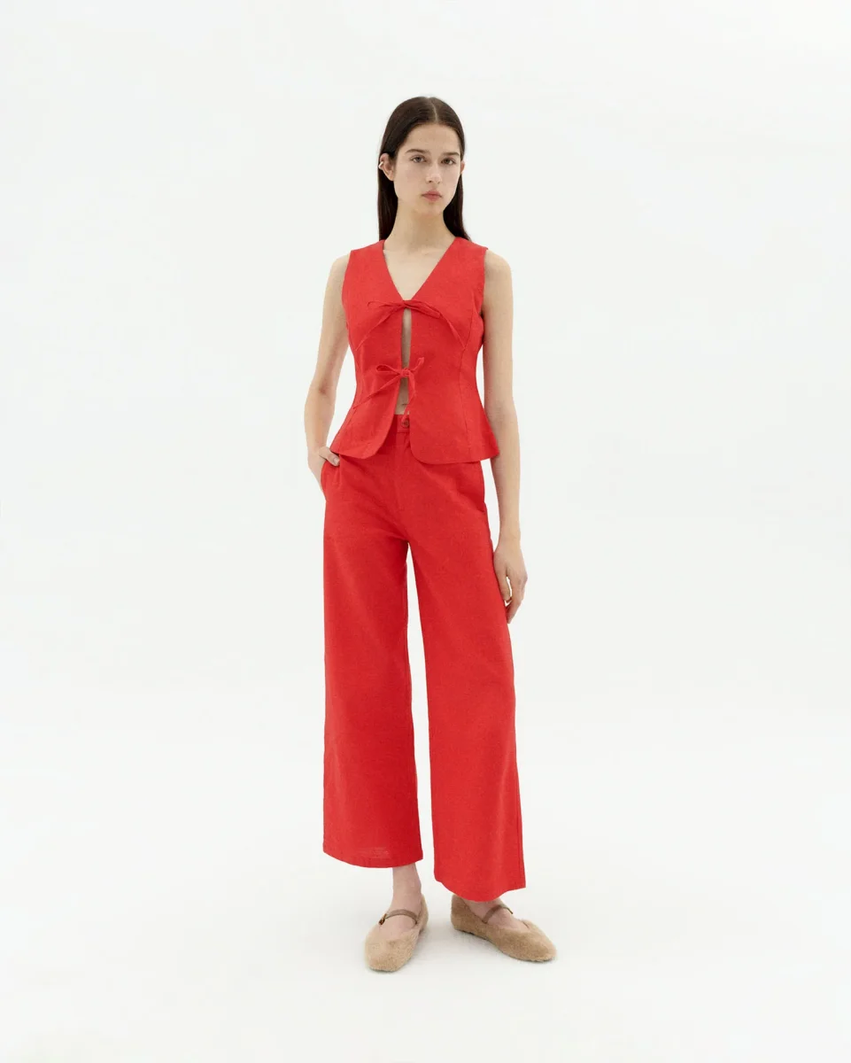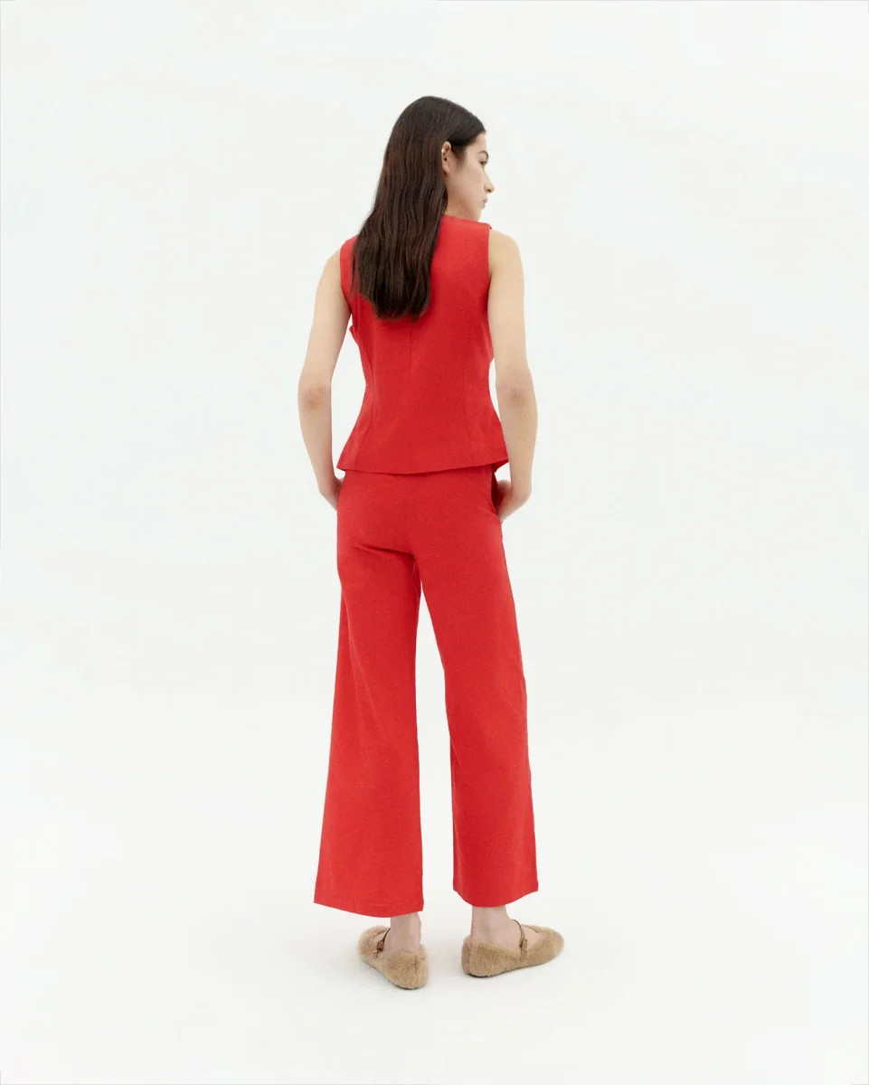 Karina röda byxor gjorda av ekologisk bomull.