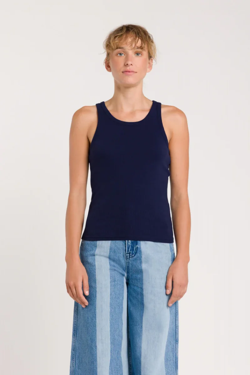 Tanktop i 95% ekologisk bomull. Kerry från K.O.I – Kings of Indigo är ett damlinne med smal passform i ett stretchigt tyg & en rundad halsringning.
