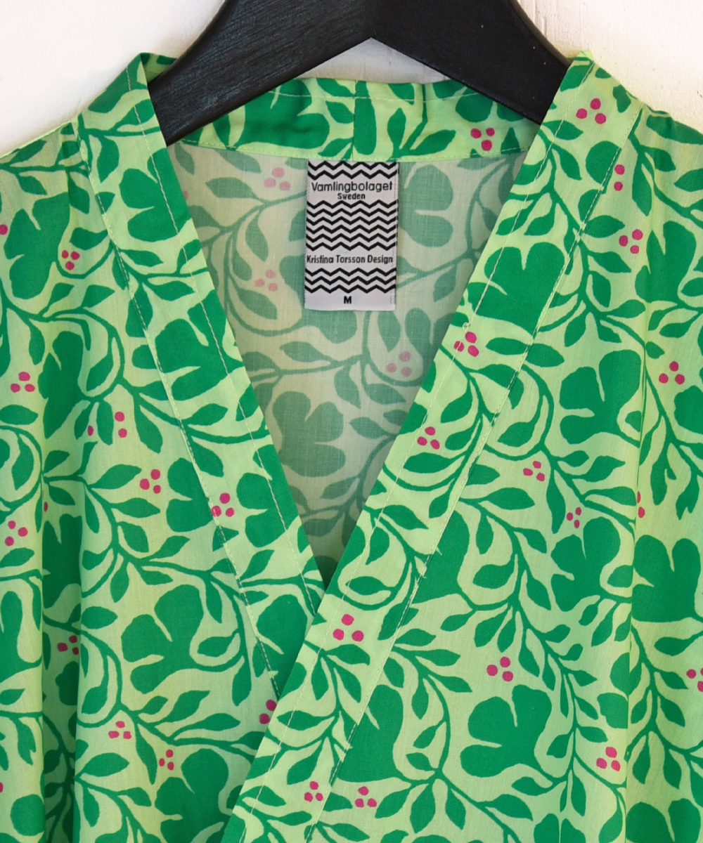 Kimono-klänning i vävd ekologisk bomull. Klänningen är relativt kort och slutar på eller strax ovanför knäet. Klänningen har trekvarts-ärmar och band som sitter fast i sidan och som knyts bak. Lika fint är det att bära klänningen öppen som en klassisk kimono. Kvalitet 100 % vävd bomull som tvättas i 60 graders maskintvätt. Krymper 2 %. Tyget är tryckt och klänningarna sydda i Portugal.