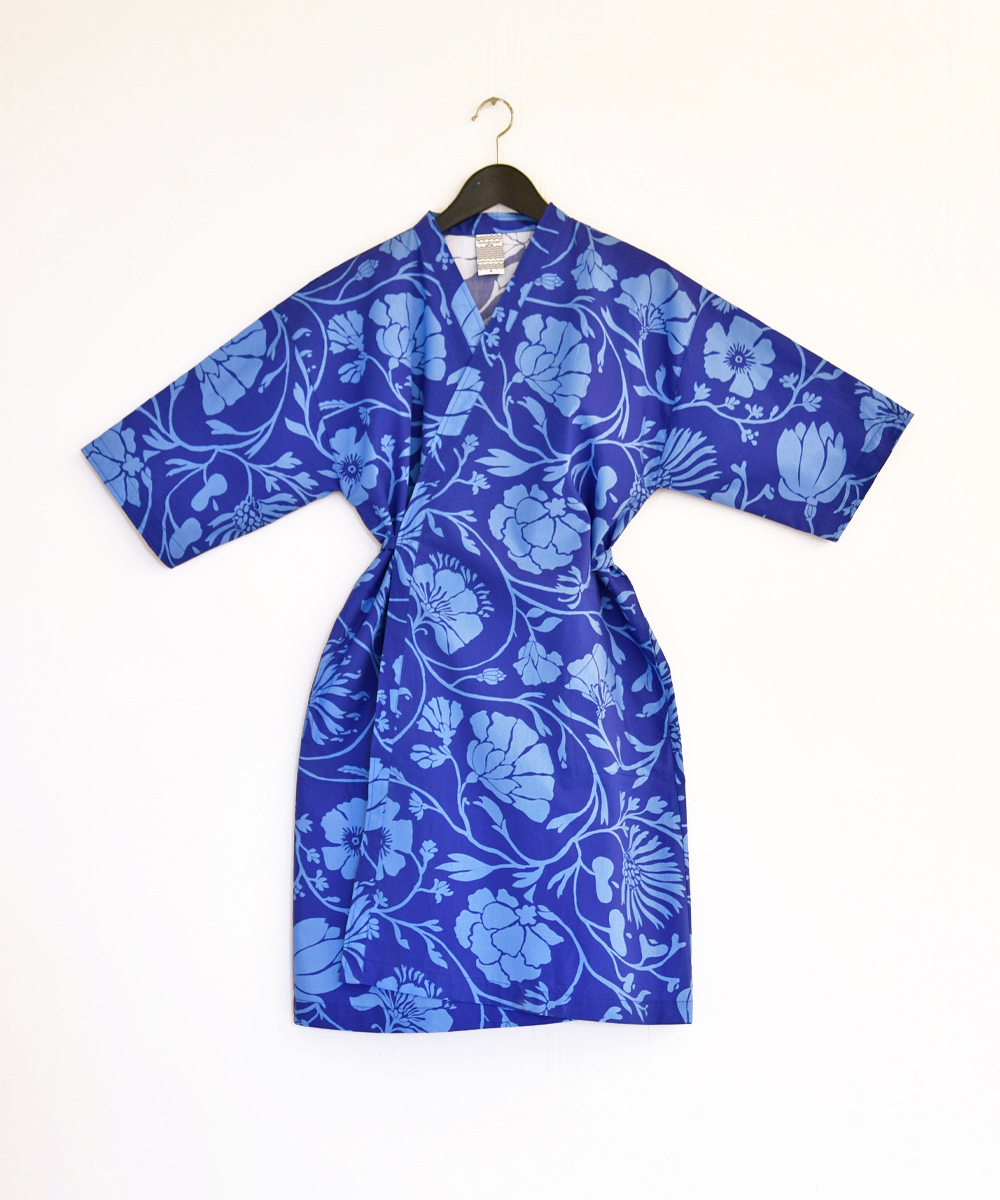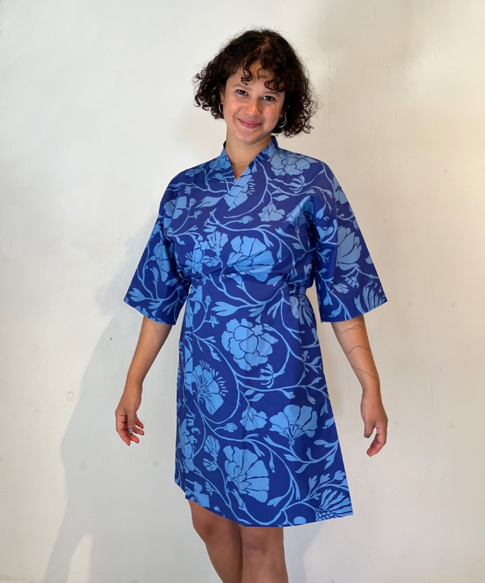 Kimono-klänning i vävd ekologisk bomull. Klänningen är relativt kort och slutar på eller strax ovanför knäet. Klänningen har trekvarts-ärmar och band som sitter fast i sidan och som knyts bak. Lika fint är det att bära klänningen öppen som en klassisk kimono. Kvalitet 100 % vävd bomull som tvättas i 60 graders maskintvätt. Krymper 2 %. Tyget är tryckt och klänningarna sydda i Portugal.