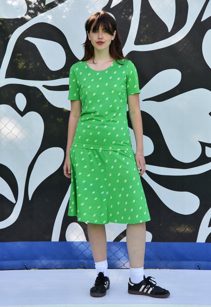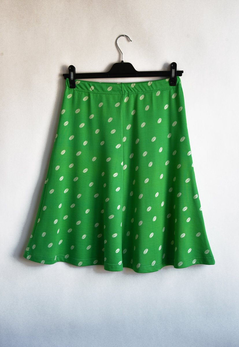 Klockad kjol i fyra våder med resår i midjan. Tygkvalitet silkestrikå 63 % viskos och 37 % bomull. Maskintvätt 40 grader.