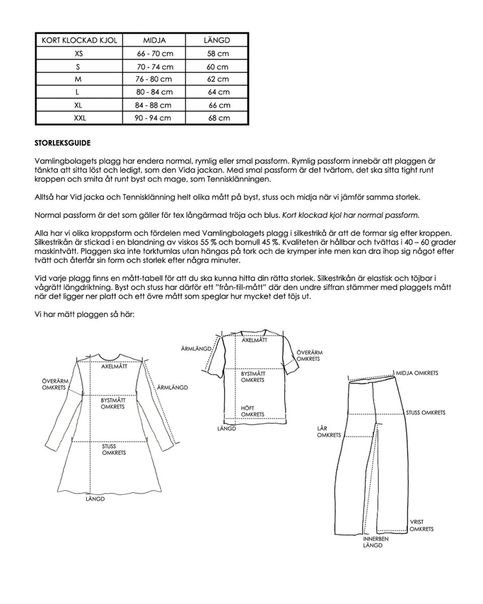 Klockad kjol i fyra våder med resår i midjan. Kvalitet 55 % viskos och 45 % bomull. Maskintvätt 40 grader.