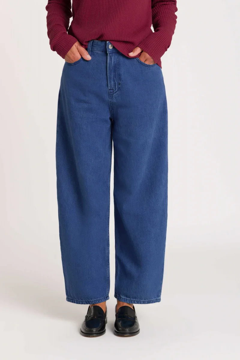Leila har en hög midja och vida, lite ballongformade ben som går in en snutta precis i slutet. En otroligt populär modell som nu också sytts upp i ett progressivt tyg i 100% återvunnen bomull.