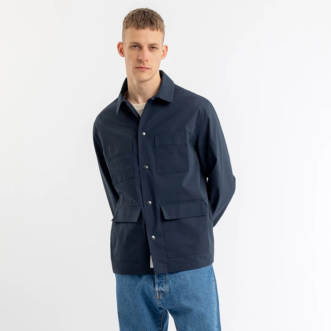 Från Rotholz kommer marinblå vår & sommarjacka så hållbart producerad det bara går i 97% ekologisk bomullsstretch (3% spandex) med ripstop. Såväl råmaterial som produktion inom EU´s gränser. Jackan är en regular fit, har 2st bröstficka & 2st magfickor samt ett rakt avslut vilket helt klart ger en mer kantig & minimalistisk känsla till skjortan.