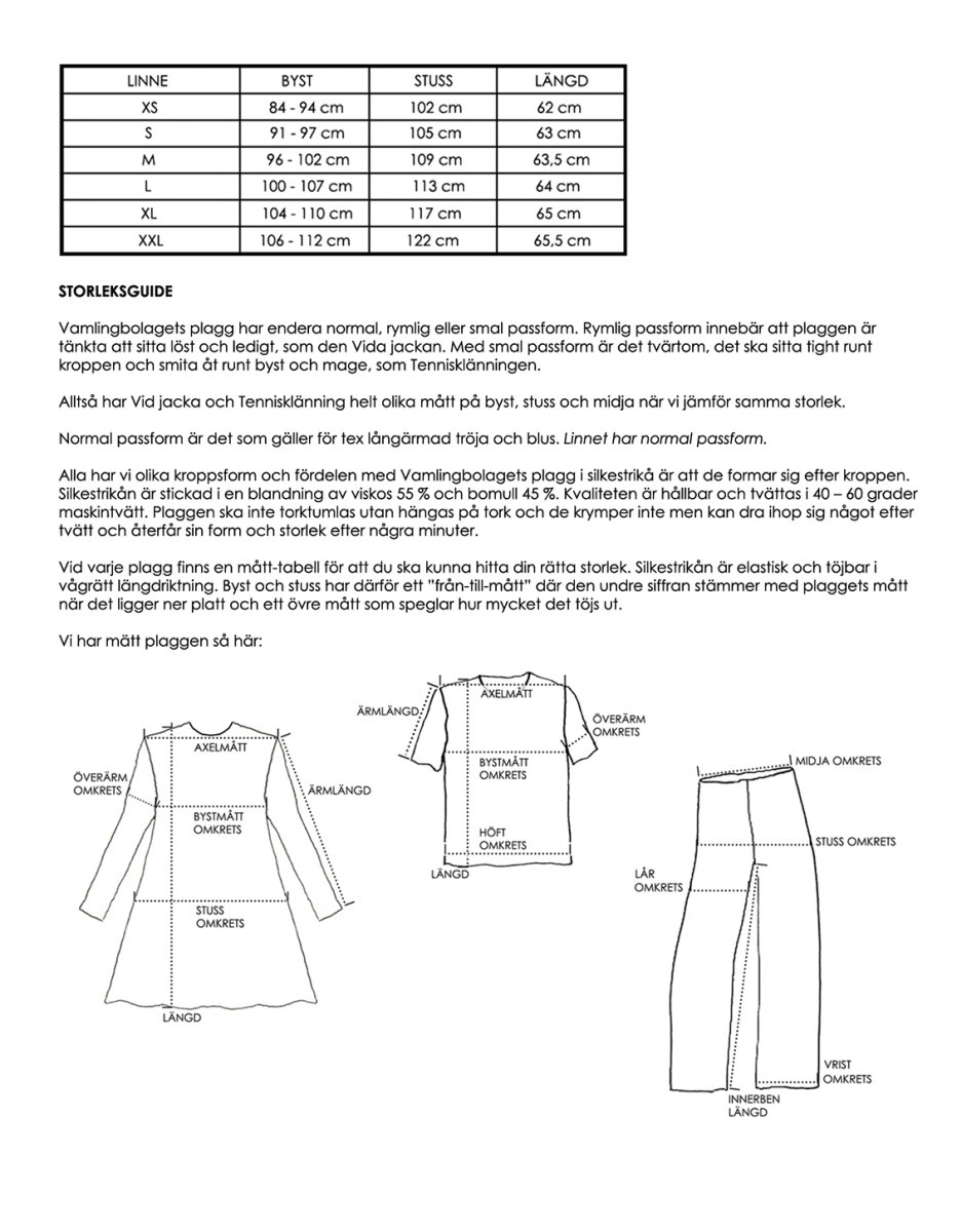 Tygkvalitet silkestrikå 63 % viskos och 37 % bomull. Maskintvätt 40 grader.