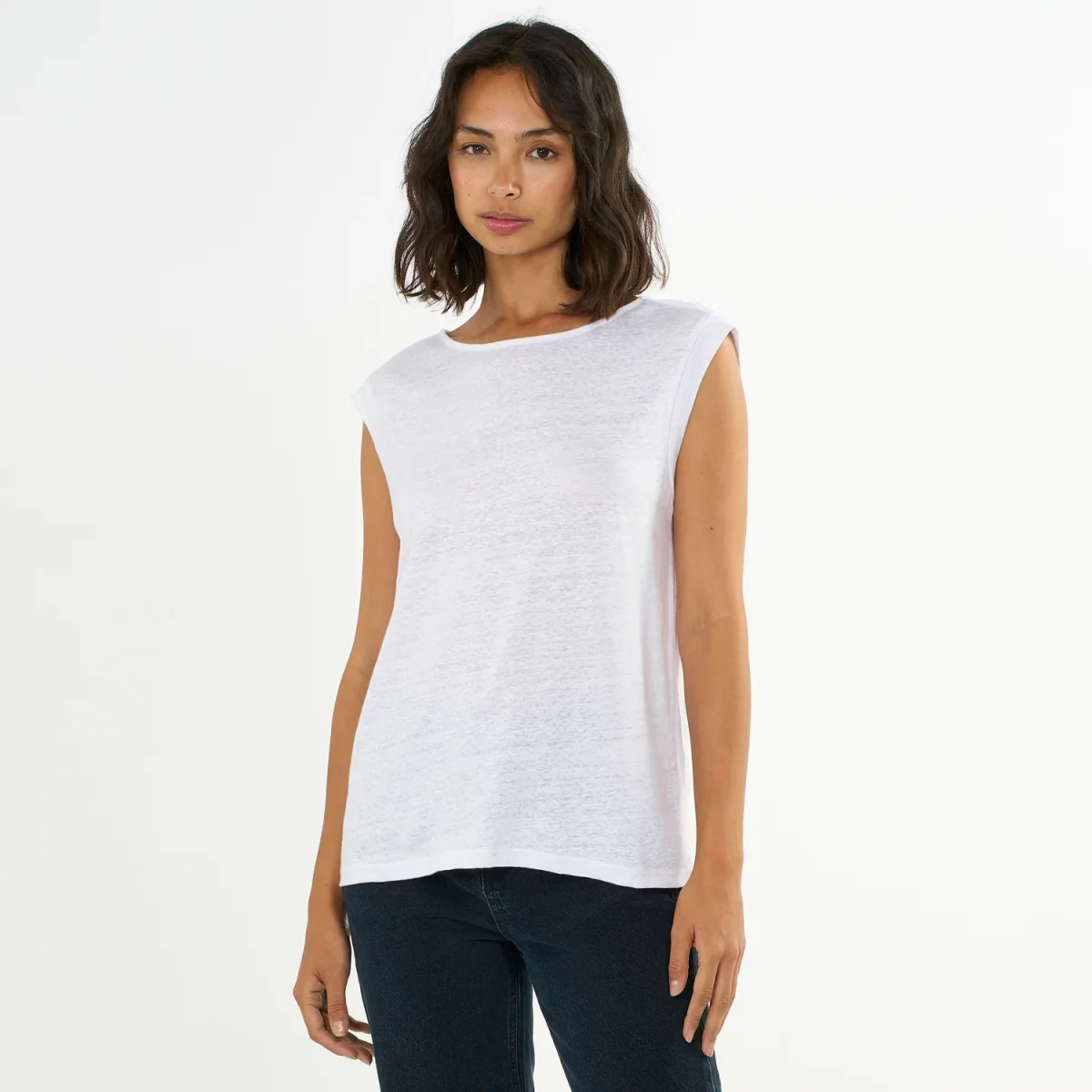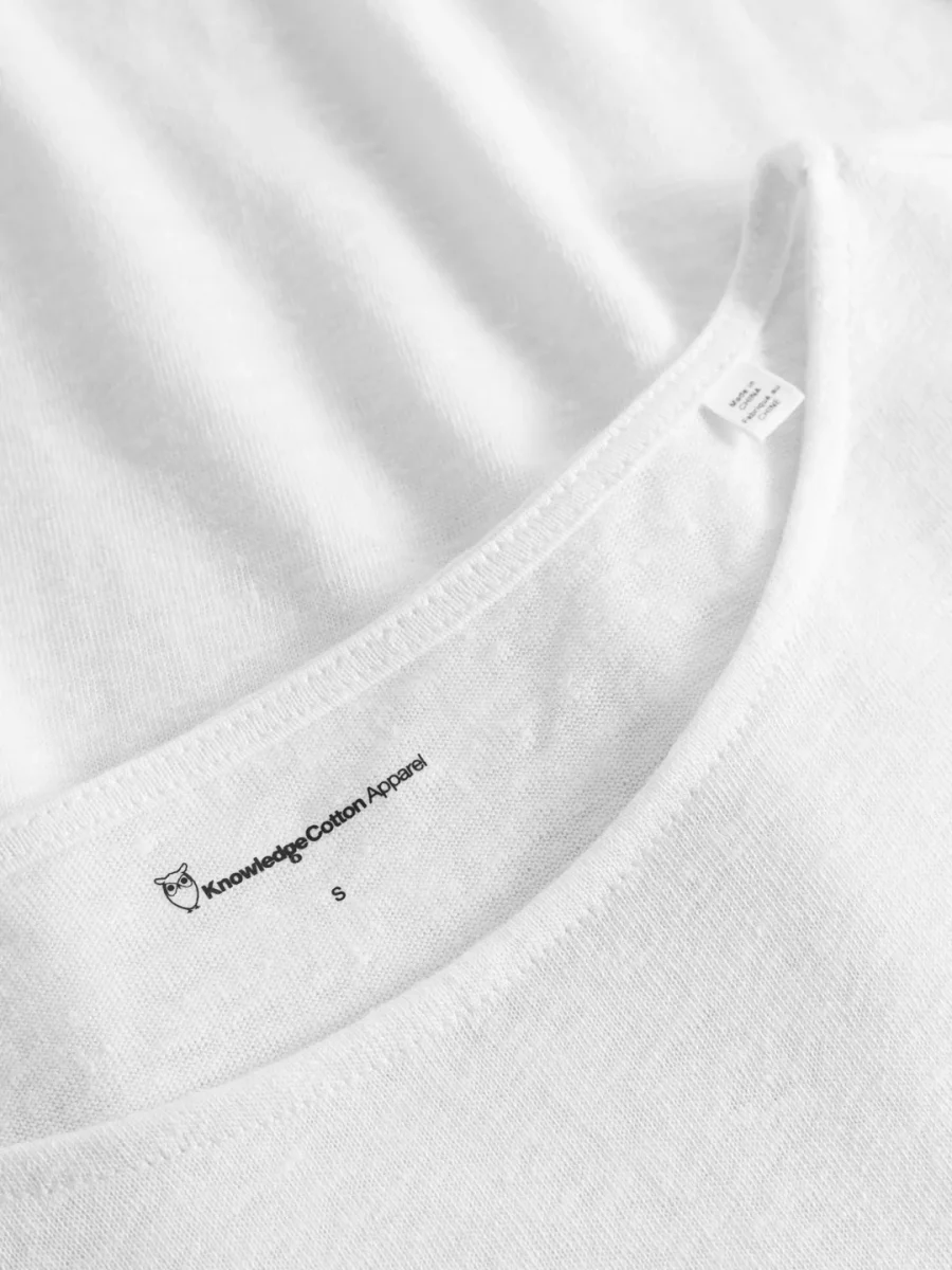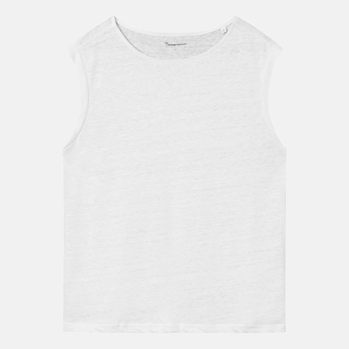 Loose Fold-Up Linen T-shirt Bright White från Knowledge Cotton Apparel är en t-shirt med uppvikta ärmar. Något av en mix av en tee & en tanktop. Kvaliteten är 100% ekologiskt odlat lintyg.