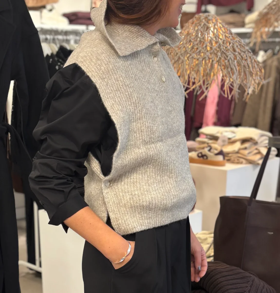 Snygg väst från M By M med hög krage och knappar framtill. Fin att sätta över en skjorta eller tunnare tröja. Matcha med ett par snygga kostymbyxor och du känner dig alltid klädd. Västen är one size och passar upp till strl 42.