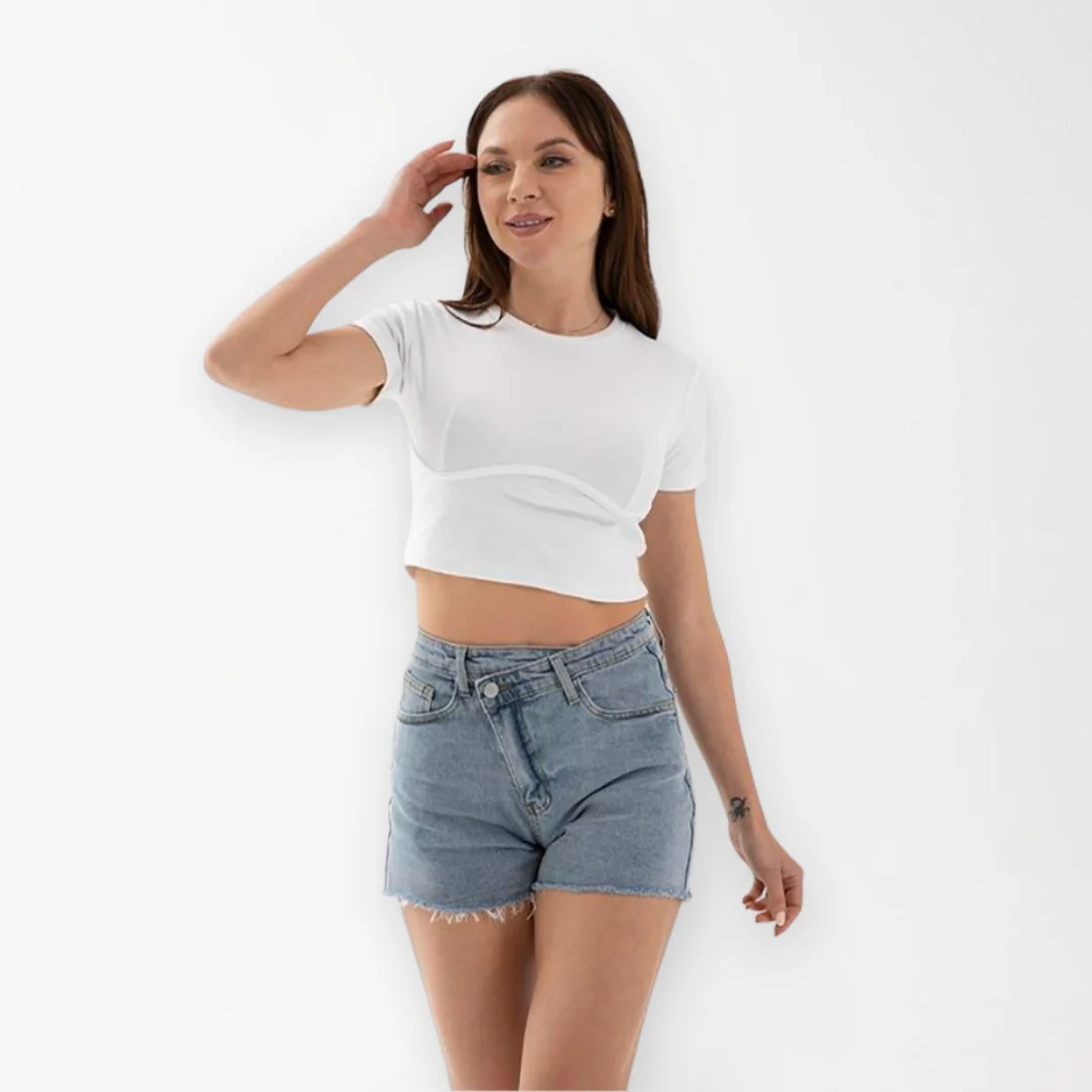 Känn dig snygg och bekväm varje dag – beställ dina Maia™ crossover-jeansshorts nu och få rabatt när du köper fler!