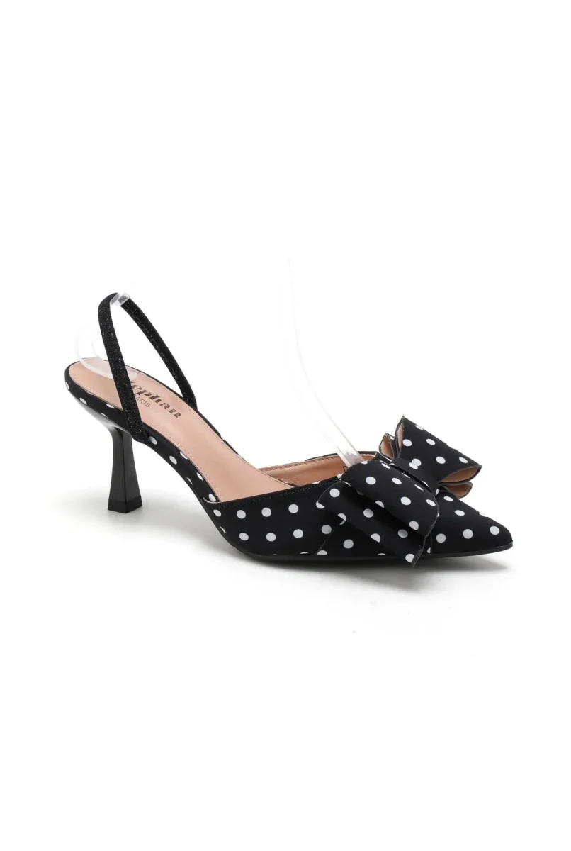 Dakota Ladies Shoes från Marta du Chateau är en feminin klackskor med det lilla extra. Den spetsiga tån, den dekorativa rosetten framtill och det prickiga mönstret ger en elegant men lekfull känsla. Slingback-modellen gör skon luftig och bekväm, perfekt för både fest och middagar.