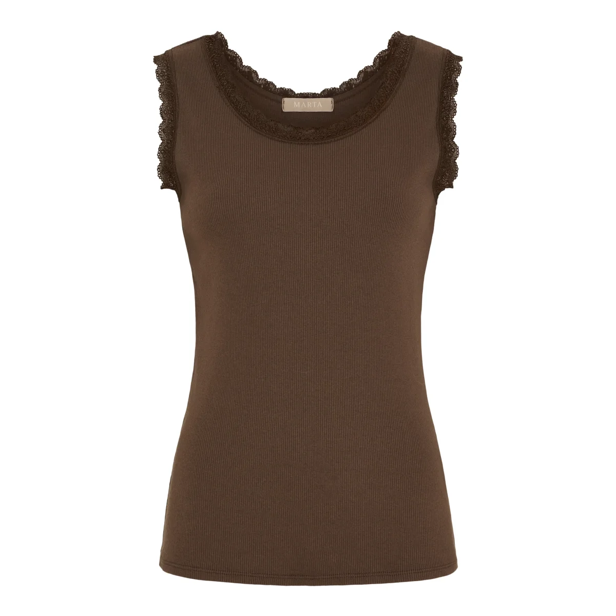 Angeline Top från Marta Du Chateau är ett elegant linne med mjuk stretch och dekorativ spetskant längs halsringning och ärmhål. Toppen har en figurnära passform och är tillverkad i ett bekvämt, ribbat material som ger både komfort och stil.