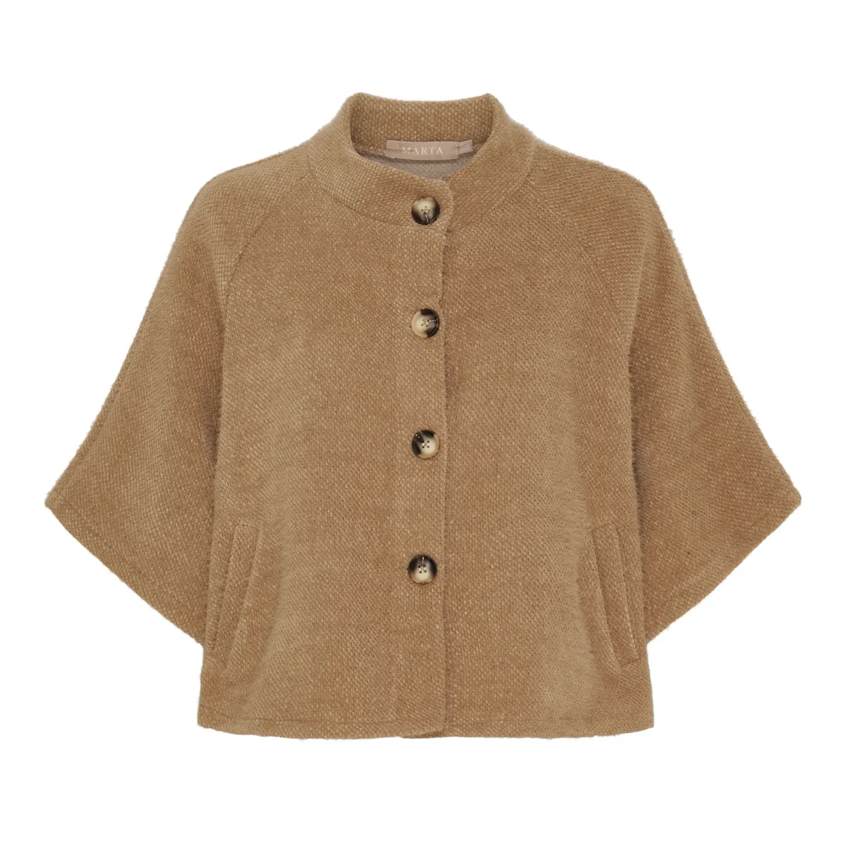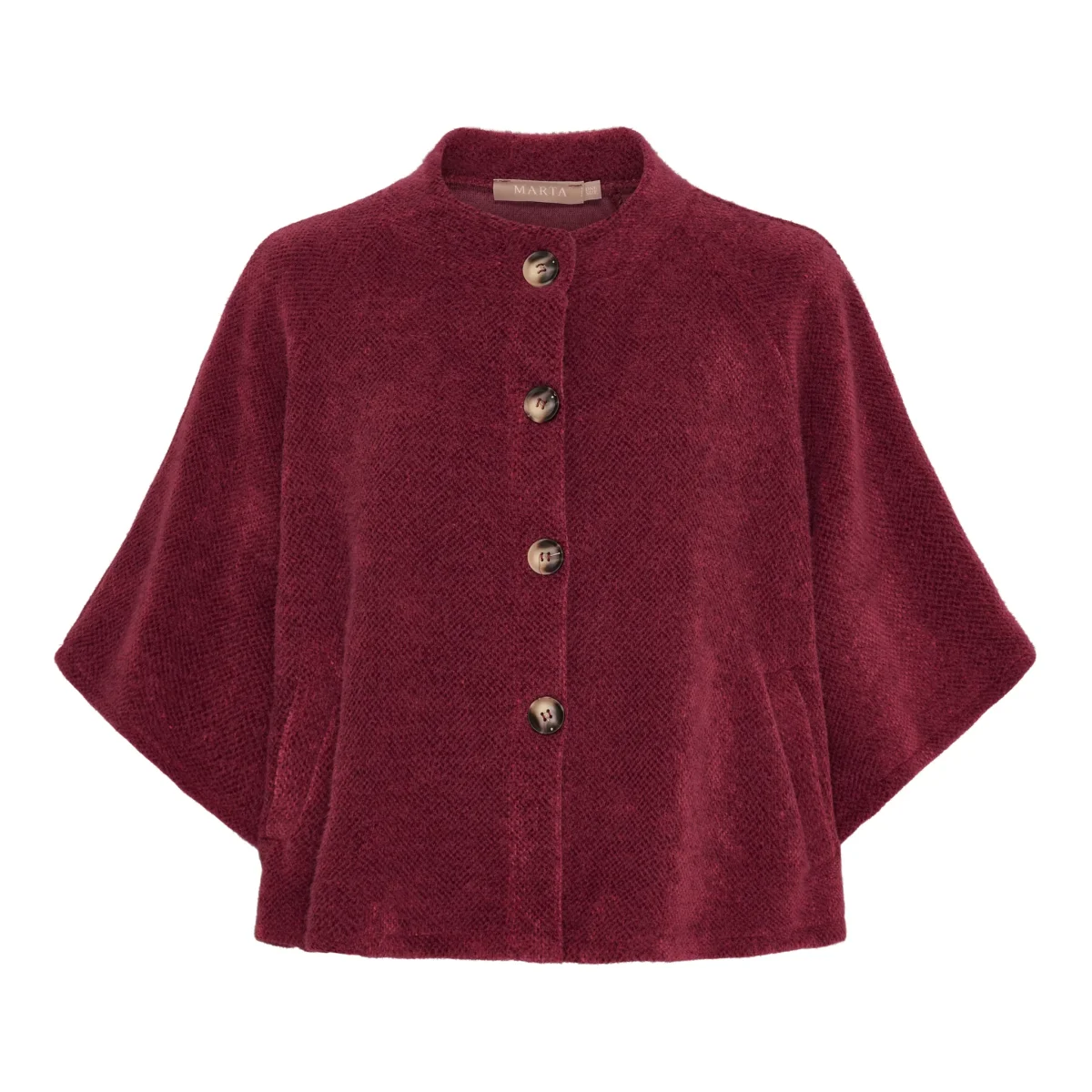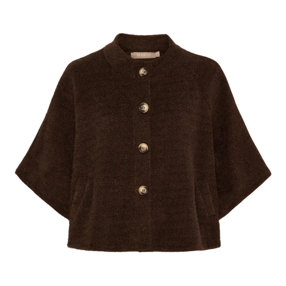 Thunder jacket från Marta Du Chateau. Denna poncho är en fin och mysigt ytterplagg som kombinerar stil med komfort. Ponchon har en rak, något boxig passform med korta ärmar, dekorativa knappar framtill och praktiska fickor. Den är tillverkad i ett mjukt och värmande material som gör den perfekt för höst och vinter.