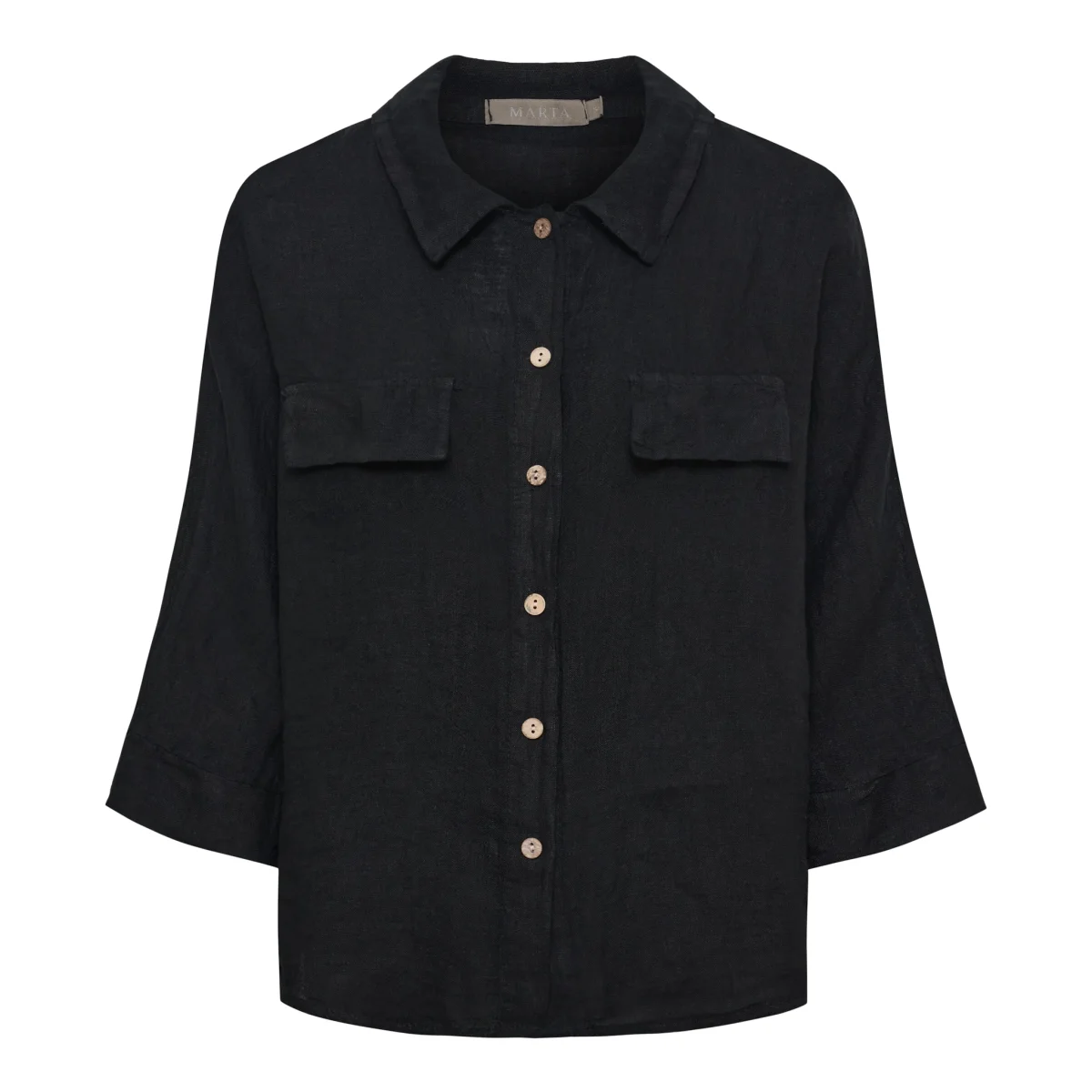 Malisa Jacket från Marta är en lätt linneskjorta i 100% linne med avslappnad form och kortare ärm. Den har knäppning framtill och bröstfickor som ger en enkel men snygg detalj.