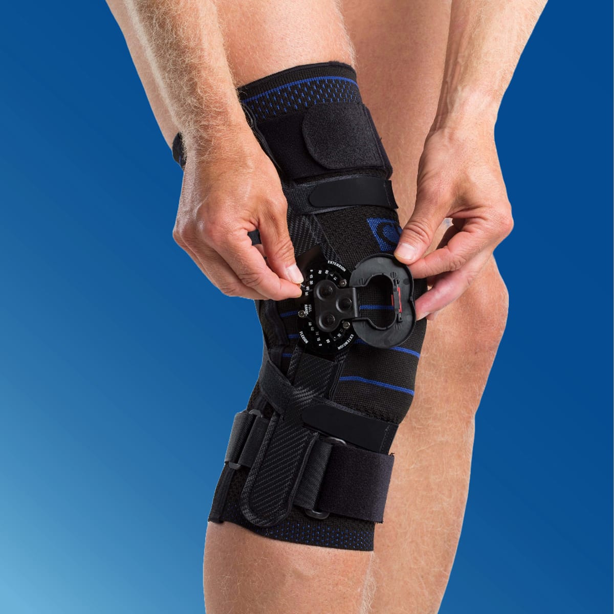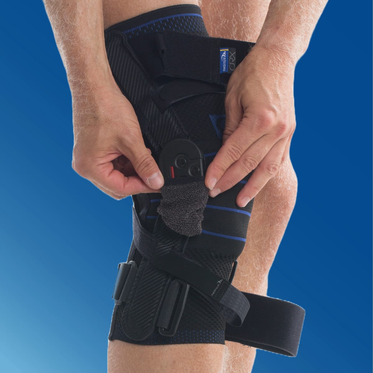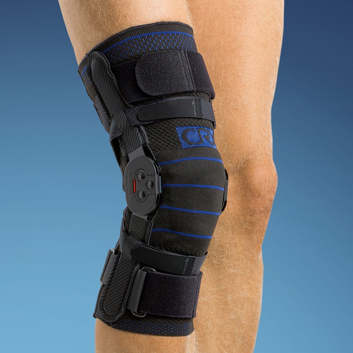 Stabilt knäskydd med ledade skenor som klarar hög belastning. Anpassat för instabilitet i knäleden och korsbandsskador.