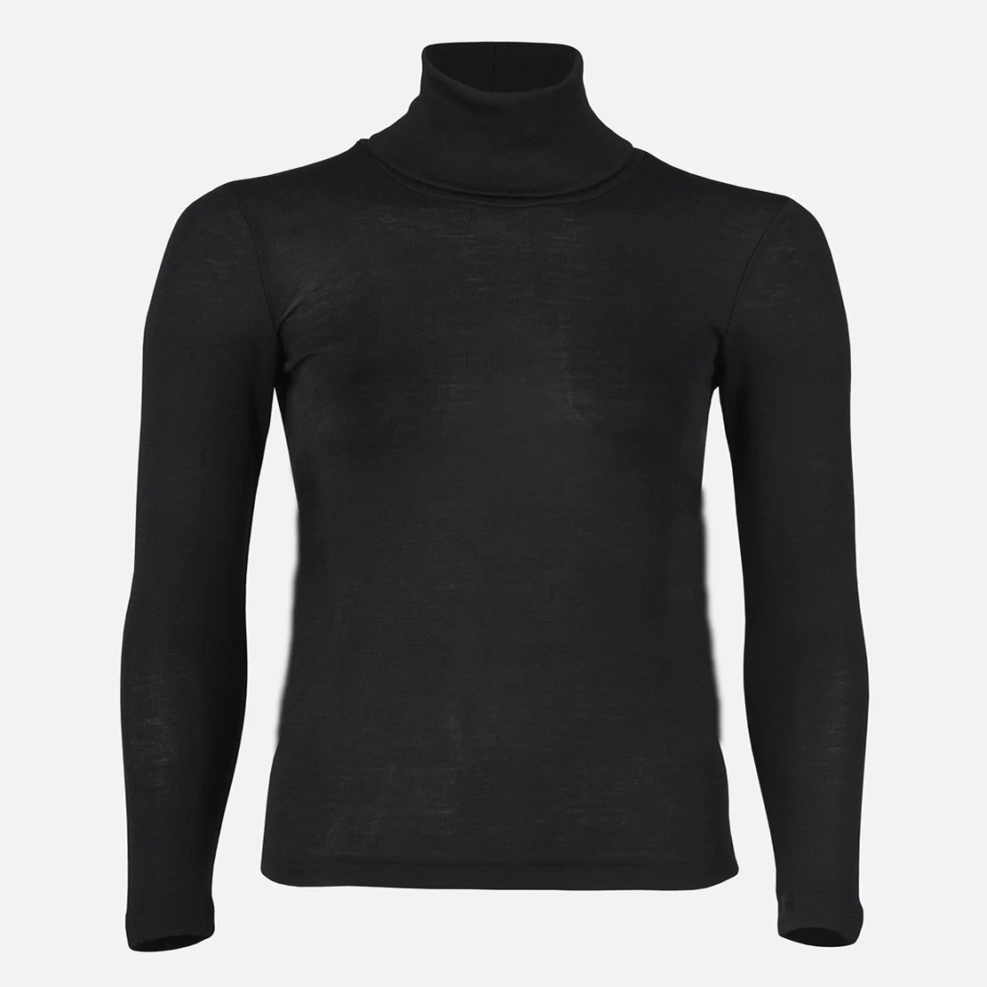 Svart finstickad underställströja med polokrage tillverkad av ekologisk merinoull & silke från tyska Engel. Något tjockare material än andra plagg i samma serie. Används lika väl som vanliga undertröja till vardags eller som underställ när det fryser på utomhus eller är dags att sporta loss. Ullens naturliga elasticitet ger tröjan dess stretch & goda passform.