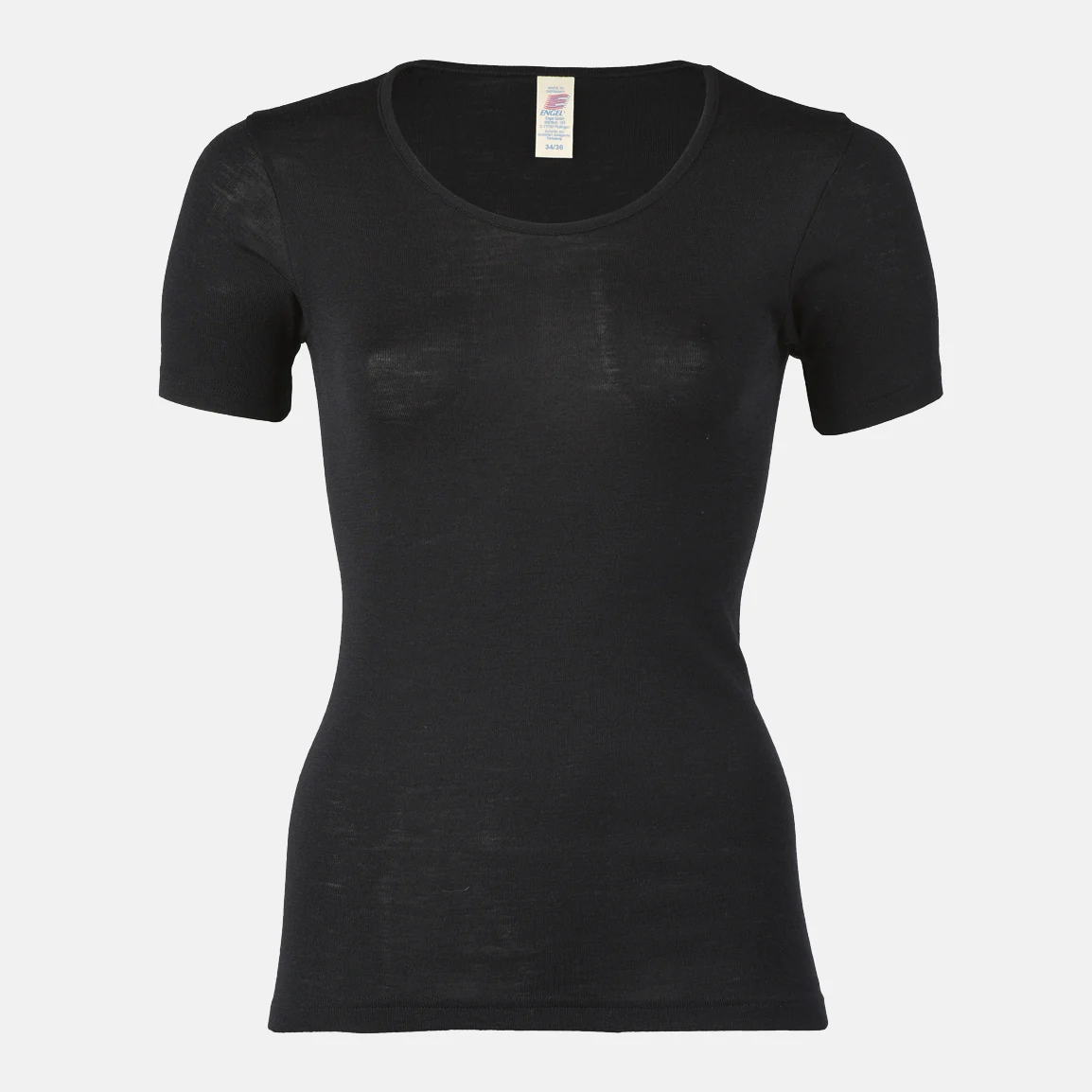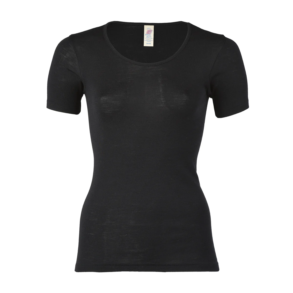 Svart finstickad t-shirt tillverkad av ekologisk merinoull & silke från tyska Engel. Används lika väl som vanliga undertröja till vardags eller som underställ när det fryser på utomhus eller är dags att sporta loss. Ullens naturliga elasticitet ger tröjan dess stretch & goda passform.