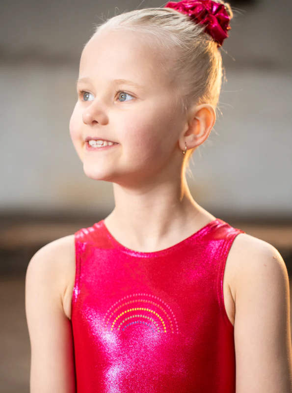 Vacker glitter gymnastikdräkt med Rainbow-transfer på bröstet. Perfekt för träning eller de allra yngstas första tävling.