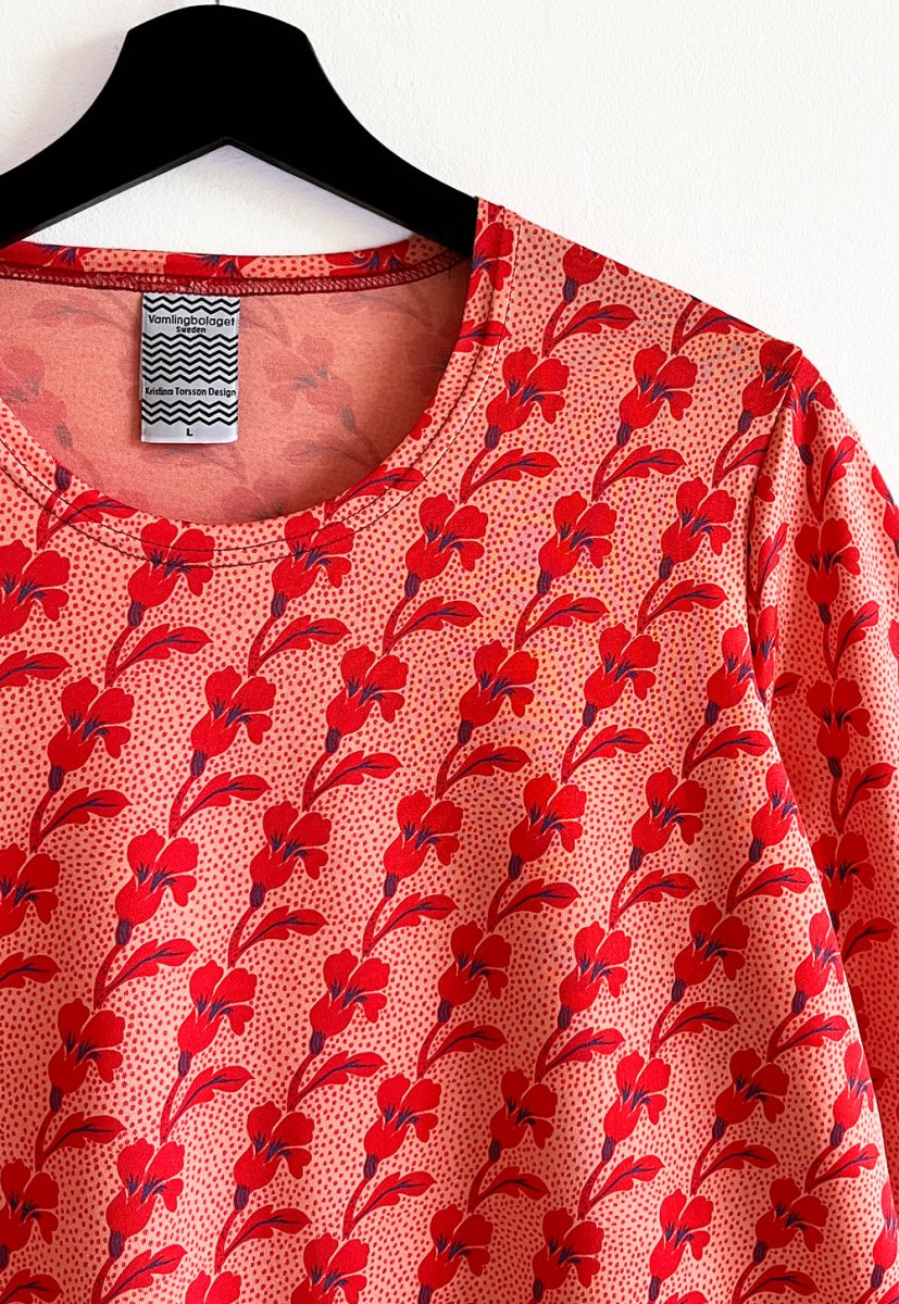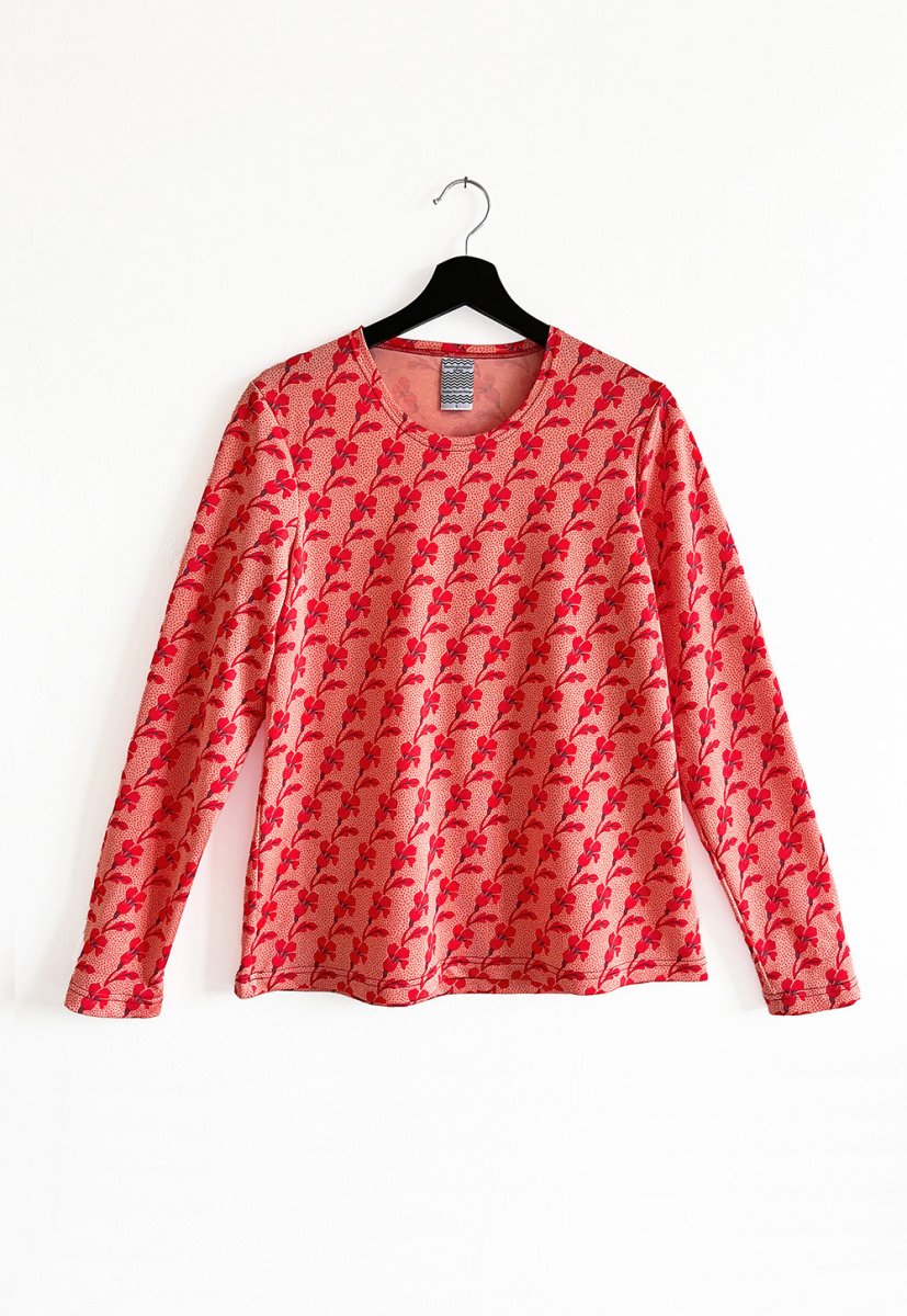 Långärmad tröja med rundringad hals med normal till smal passform i vårt nya mönstret Tulpanlilja i färgen Röd Persika. Maskintvätt 40 grader.