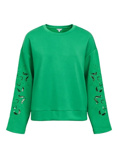 Dorina Pullover från Object är en avslappnad och stilren tröja med en modern siluett. Den klara gröna färgen ger ett fräscht uttryck, medan de dekorativa utskärningarna längs ärmarna tillför en feminin och genomtänkt detalj som lyfter helheten.