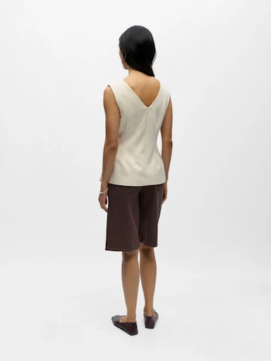 Materialet känns mjukt och skönt mot huden, vilket gör den bekväm att bära hela dagen. Den är ärmlös och lätt att styla, perfekt både varma dagar eller under en kavaj.