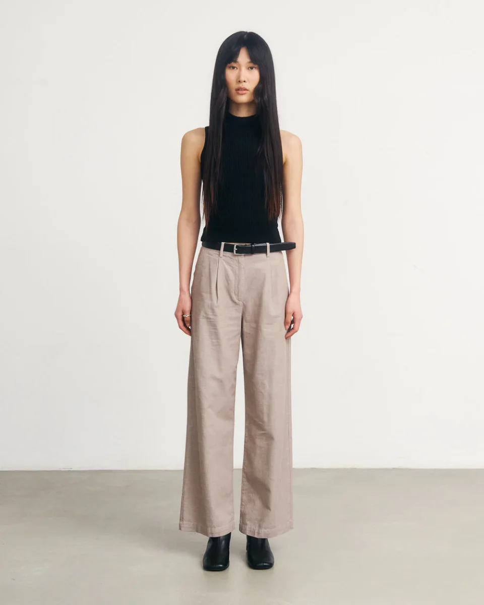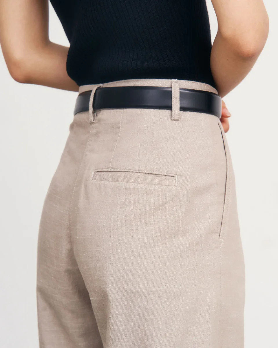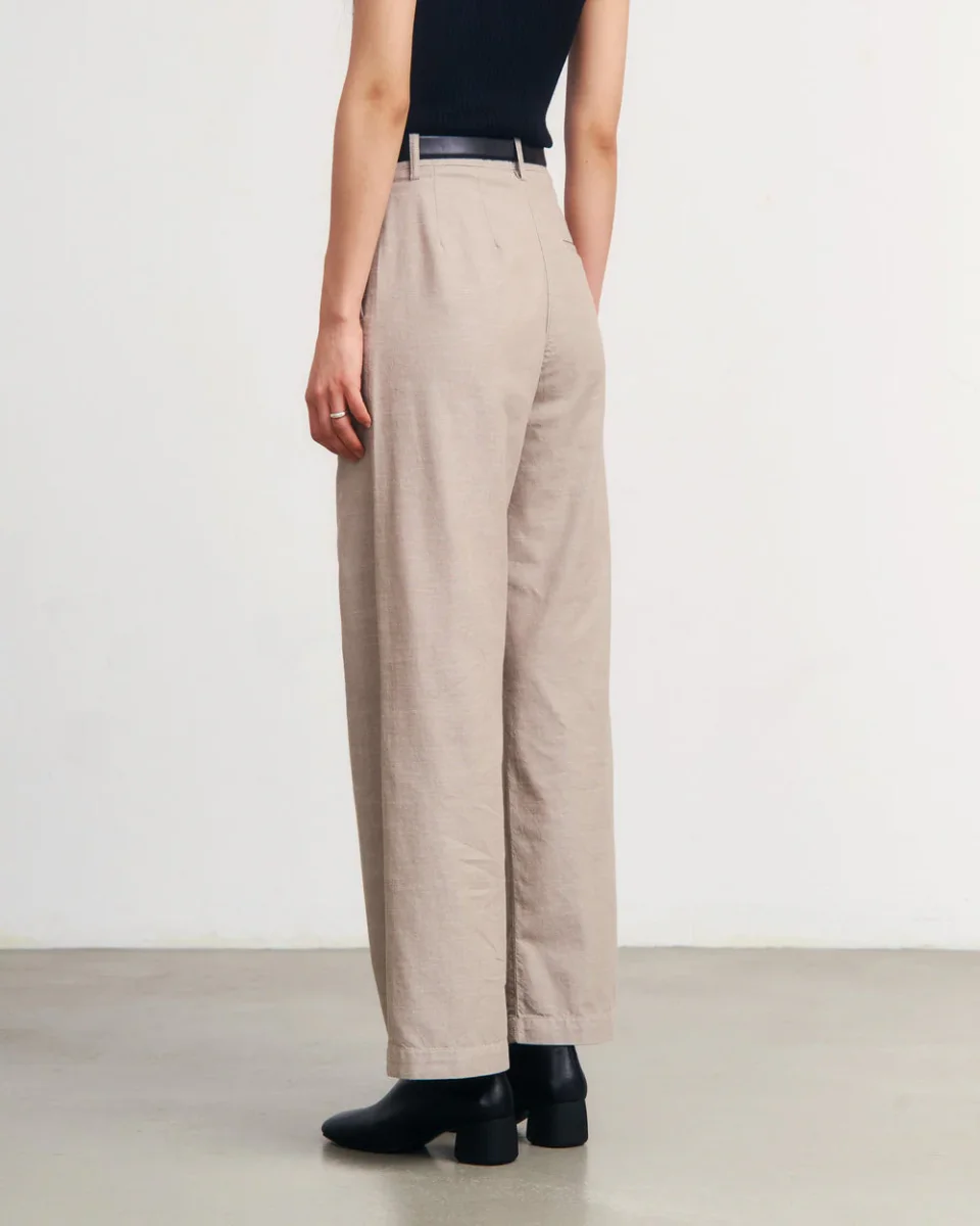 Snygga bomullsbyxor med hög midja, rymliga lätt utsvängda ben samt en liten plissering upptill. Tillverkade i 100% ekologiskt sandfärgat bomullstyg som lyckas vara både slitstarkt, vackert och bekvämt. Veganvänliga och tillverkade inom EU.