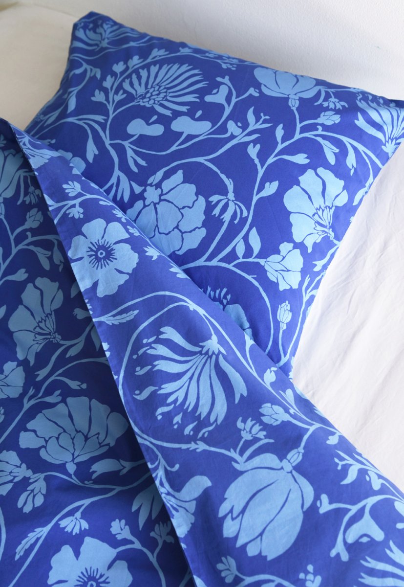 Lakanset innehållande påslakan (210 cm x 150 cm) och örngott (50 cm x 60 cm). Den ekologiska bomullen är vävd och tryckt i Portugal i vårt mönster Varma Backen i blått och ljusblått. Kvaliteten är underbart mjuk och skön!