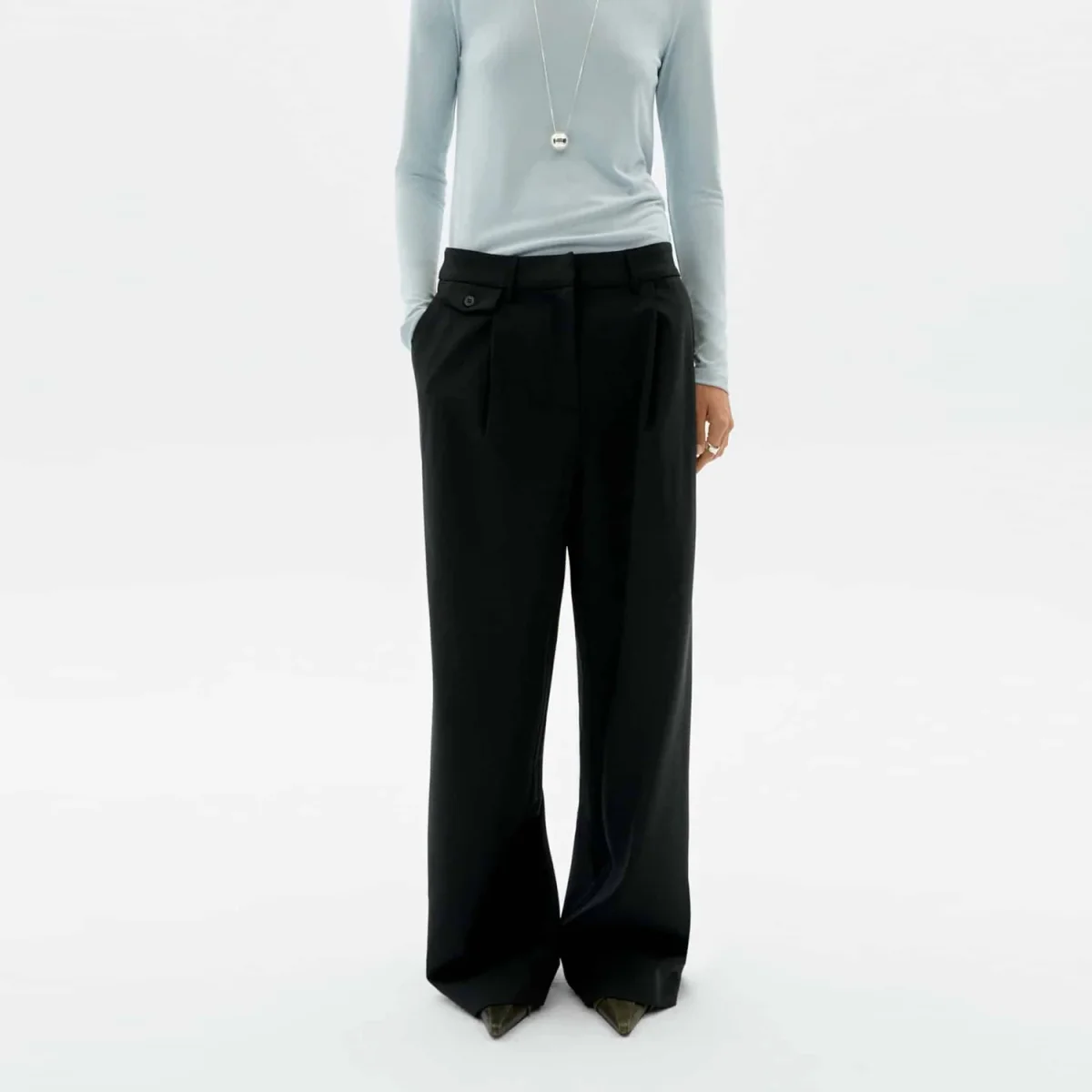 Svarta ullbyxor med låg midja & stretch & vida ben. Liten extraficka med knapp på vänster sida midja. Modellen är 177 cm lång och bär storlek 36.