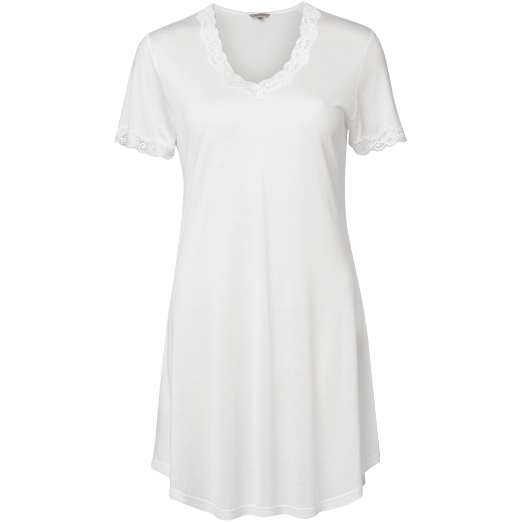 Lyxigt nattlinne som är behaglig att ha på sig. Nattlinnet har en rundad botten, korta ärmar med elastisk spets vid hals och ärmöppning. Normal i storlek med lös passform.