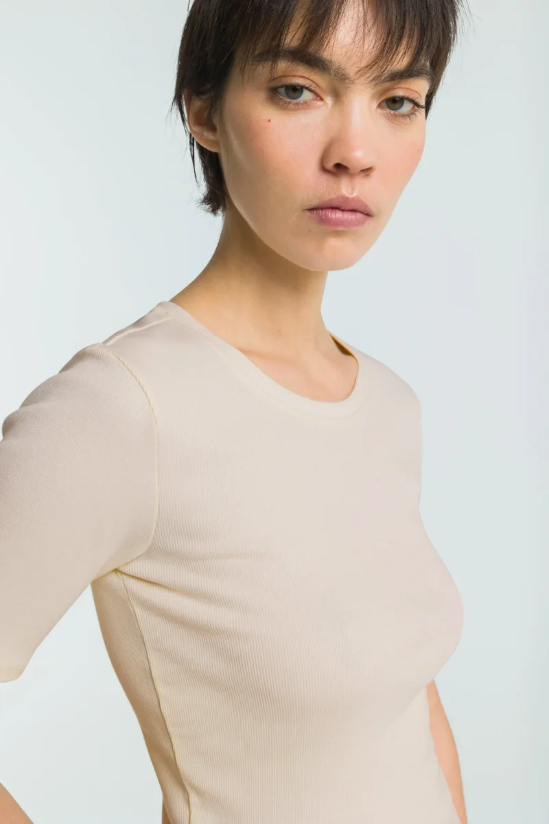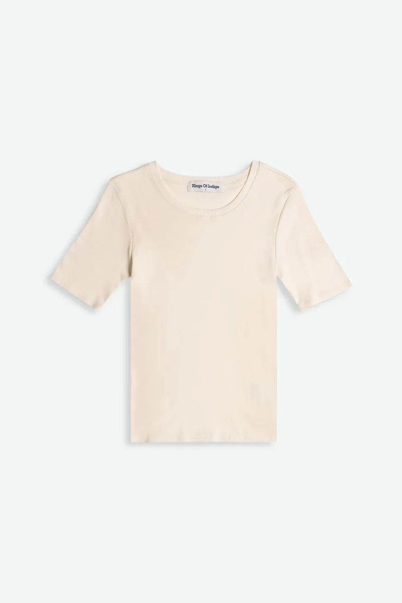 Rina har en smal passform med korta ärmar och rundad halsringning för en ren, minimalistisk look. Tillverkad av GOTS-certifierad ekologisk bomul. Rina erbjuder andningsbar komfort med en flexibel, smickrande form. Den benvita färgen ger en mjuk och mångsidig bas – perfekt att bära på lager eller som den är.