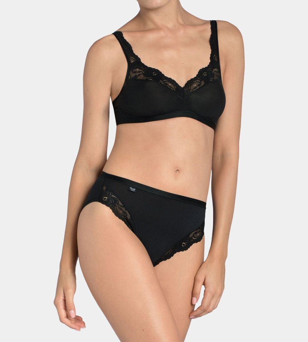 Extra fin spets framhäver underkläderna i Romance-serien från sloggi med plagg som är tillverkade av en blandning av bomull och mikrofiber. Den här trosan framhäver stilen med spetsdetaljer och ett lätt glansigt material. Finns i svart och vit.